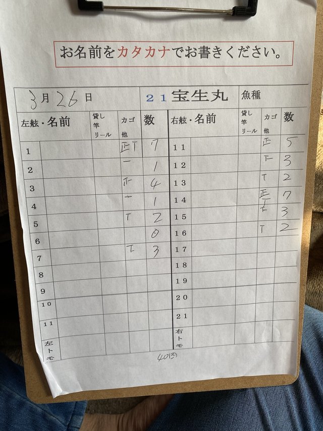 1.00~3.10kg 0~7匹 良い反応が見れてバタバタっと次々に当たりが出ました。 本日もご乗船いただきありがとうございました お疲れさまでした 感謝🙇♀️ 明日は満席となりました。 宜しくお願い致します🙇♀️