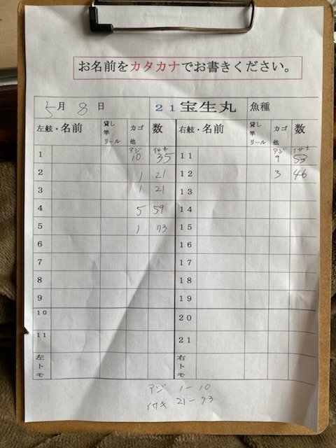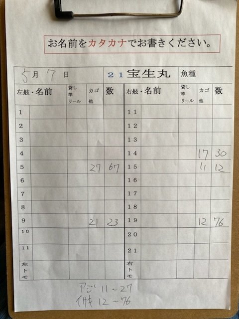 30~42cm 8~14匹 イサキ 22~35cm 28~96匹 前半のマアジ狙いは大型の食いが良く、皆さんバッチリお土産を確保してからイサキに変更しました。 出だしはサバの邪魔があったものの、治まってからは入れ食い状態で多点掛けも多く、納竿までバリバリが続きました。スソの方は途中リタイアでしたがその他の方は50匹以上でクーラー満杯かそれ以上でした。