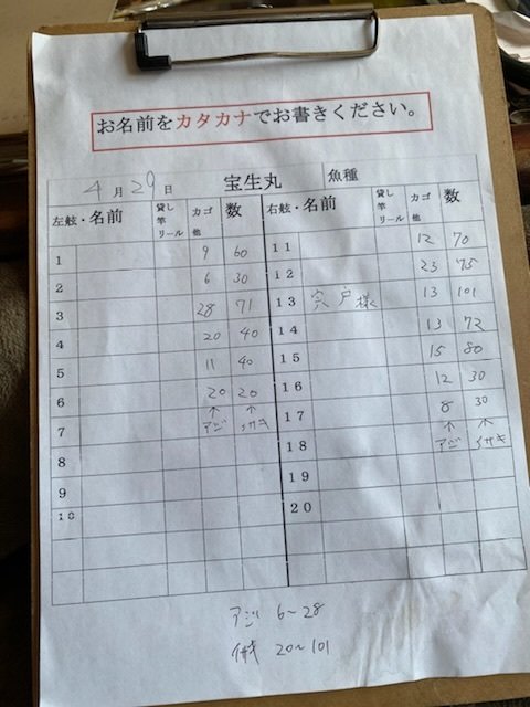 30~42cm 1~9匹 イサキ 22~35cm 21~66匹 前半のマアジ狙いは大型ばかりでポツポツ食いがありました。 イサキに変更後は食いが出だしは良くなかったものの、徐々に食いが良くなり中盤以降は入れ食い状態で、皆さんお土産には十分な釣果となれました。