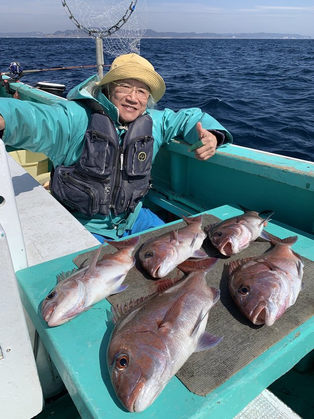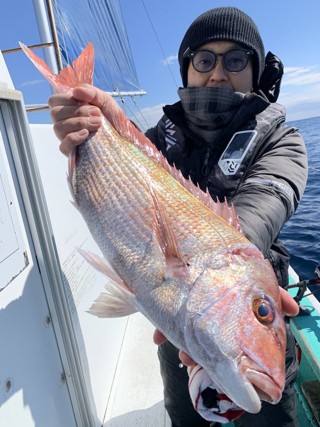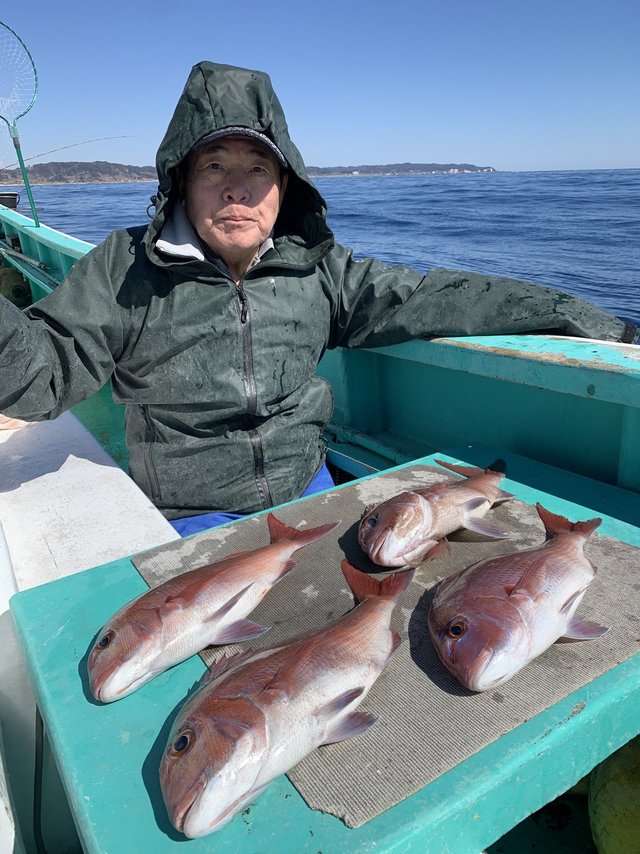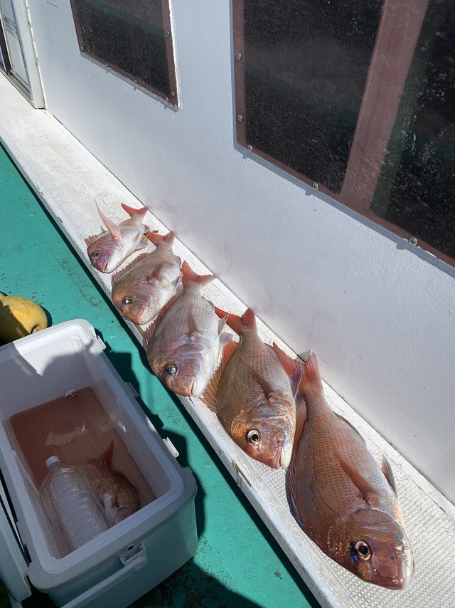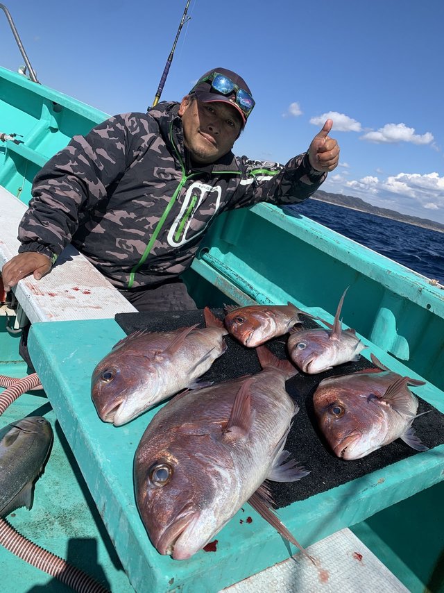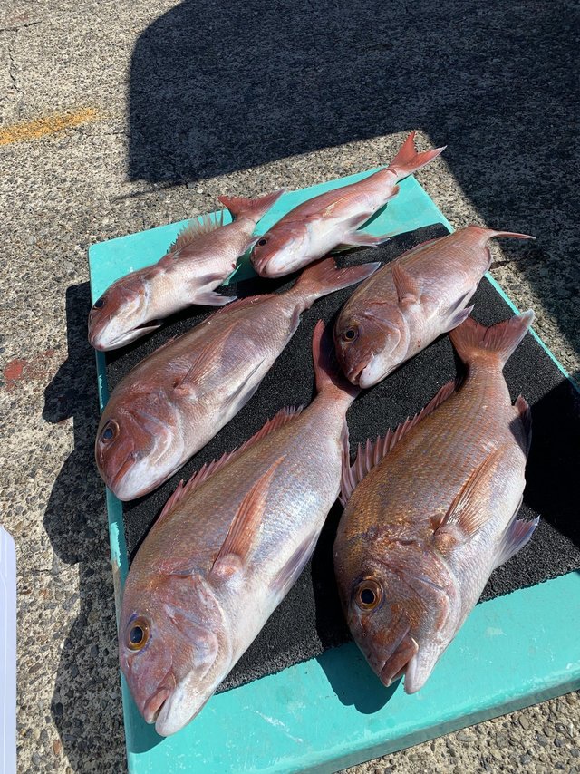 【釣行時間】5:45〜11:15【潮汐】中潮(月齢17)満潮6:46干潮11:44【気温】14〜17℃【水温】21.8℃【水色】やや澄み/暗→やや澄み/紺→やや澄み/青緑【風】北東強→北強【波】東中【潮流】無し→真潮0.4〜0.8kt→込み逆潮0.4〜0.6kt→逆潮0.3〜1.1kt【乗船人数】4名。 本日【アジ泳がせ/コマセマダイ五目釣り】…のつもりで、餌アジ釣りを行いましたが、アジの釣果はいまいちでした…。 でも、ムツやイワシが釣れる中、少々は釣れます。というわけで、お得意のコマセマダイです。本日も凄腕揃い。アジが無くて、ムツ泳がせでショゴもGET〜。本日も満足釣果〜。