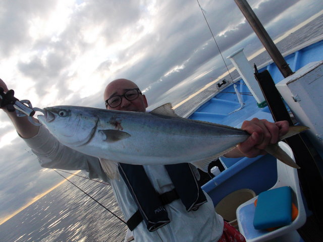 (ブリ)3.50~4.50kg 2~3匹 ウッカリカサゴ 1.10kg 0~1匹 【釣行時間】4:30〜10:00【潮汐】若潮(月齢25)干潮7:17満潮13:57【天気】晴れ→曇り→晴れ【気温】21〜29℃【水温】21.3〜22.6℃【水色】濁り/暗→澄み/紺→濁り/青緑/ゴミ【風】無し→北東弱【波】無し【潮流】無し→込み真潮0.7〜1.1kt→無し→出し逆潮0.3〜0.5kt→無し【乗船人数】2名。 本日は【SLJ(スーパーライトジギング)五目釣り】〜。朝から沖に巻き網漁船の船団が来てます…魚巻かれてるなあ〜えー?と思いつつ出船。 SLJ初めての人もいるとの事で水深30〜 50mを探ってみましたが、反応は乏しく…。 水深90mでウッカリカサゴHIT。 6:50頃、鳥が湧いてきてHIT、ワラサかな{16;?サンパクかな〜?初挑戦でサンパクGET!!やりました〜。その後、最後に水深35m辺りでも数発HITあり、合計5本です