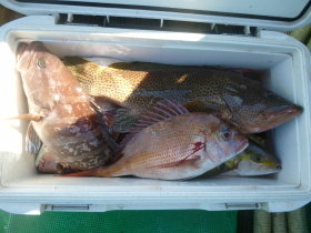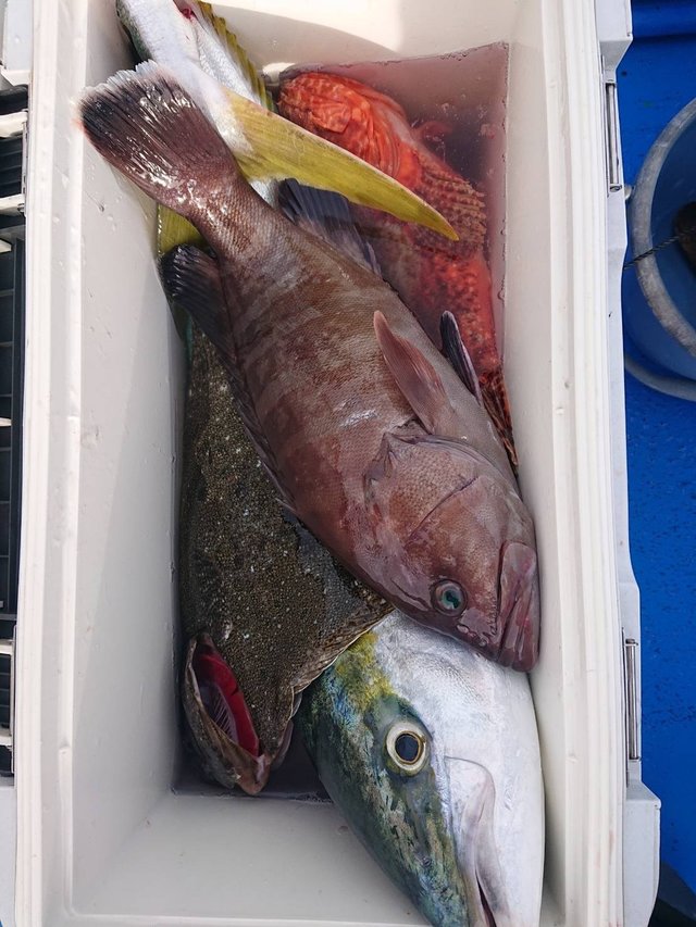 1.50kg キントキ 30~41cm 1~6匹 カサゴ AM5:00出船。 連日、猛暑厳しい中、乗船ありがとうございます。 本日のキントキ五目は、2枚潮と、サバ多く 苦戦となってしまいました。 あがれば良型ですが・・・。 1.5キロマハタと、カサゴは多数混じった。 明日はアジ~アジ泳がせのハタ狙いに出船で、空きあります。 本日発売の「つり情報」に、赤い衝撃南房のキントキ五目 が掲載されてます。 是非ご覧下さいませ。