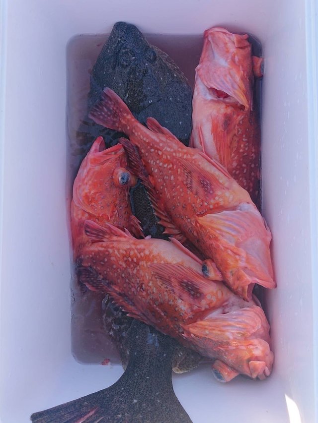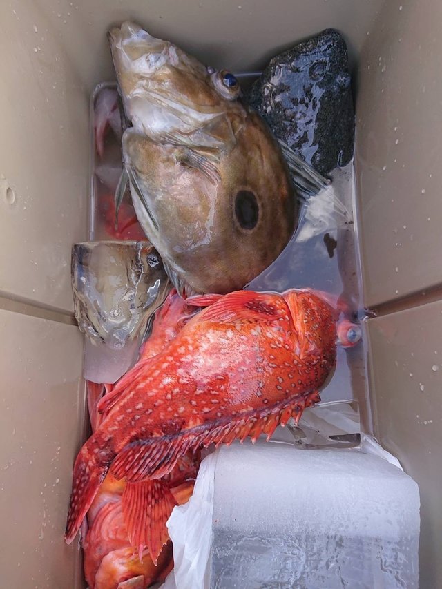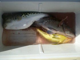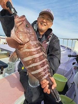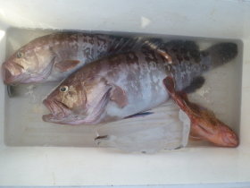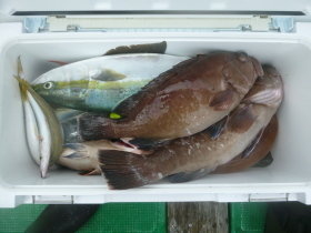 マハタ 2~5匹 アオハタ カンコ カサゴ 根魚五目船。マハタ(2~5尾)、他ヒラメ、アオハタ、カンコ、カサゴ。