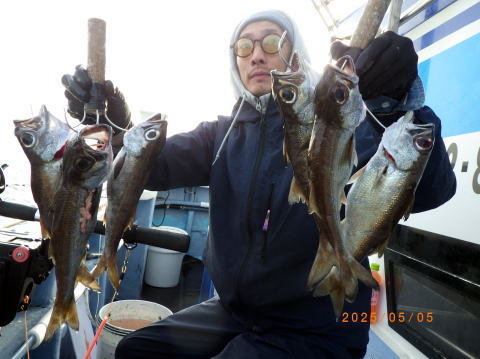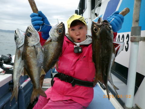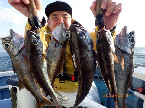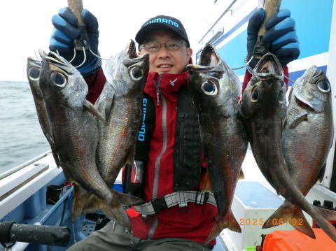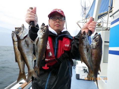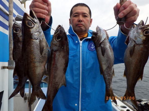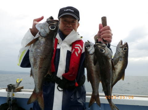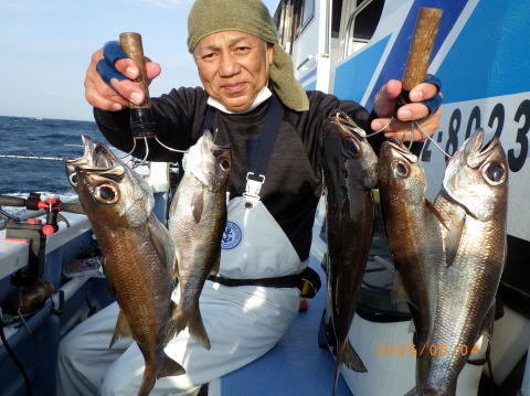 (アカアマダイ)クロムツ 竿頭6匹 メダイ サバ オアカムロ キダイ ホウボウ カイワリ フラッシャーサビキ五目のクロムツ~アマダイ五目のリレーへ出船。 Fサビキ五目は、クロムツポツリポツリで反応はありましたが、盛り上がらずほとんどの方、顔見れてトップ6匹。大型も交じりました。 良い外道は反応バリバリでジャンジャンバリバリ食いました。潮の流れはまだ速めでしたが、手返しの良い方は、2回3回とできて数伸びました。手の遅い方は1回でしたが、それでも数付いたので、お刺身サイズも多く交じって、皆さんお土産バッチリ~クーラー満タン超え。 他にメダイ・サバ・オアカムロアジ交じって好調。良い外道は慣れてる方は爆釣と言って良いですね。 後半のアマダイ五目は、アマダイ中型ポツリに、キダイ・ホウボウ・カイワリなど交じりました。