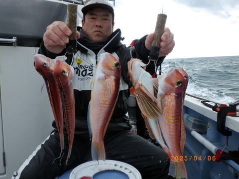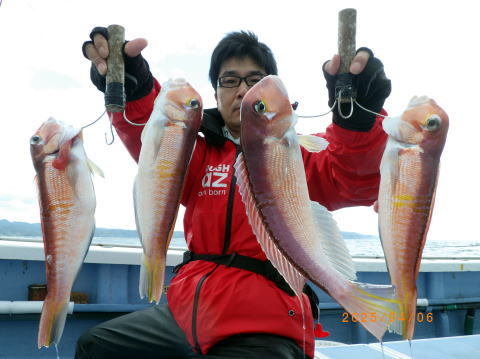 Fサビキ五目魚種多彩に好調!! フラッシャーサビキ五目のクロムツ~アマダイ五目のリレーへ出船。 Fサビキ五目は、クロムツ・良い外道・ハチビキ・オアカムロアジ・メダイ・サバ・大型ソウダガツオなど魚種多彩に好調でした。 クロムツは良い外道に交じって良型中型トップ6匹。良い外道は型交じりでしたが、お刺身サイズも交じって、ゾロゾロ~もありましたが、まだ潮の流れ速く1流しできても、1回か2回でした。それでも楽勝規定数達成してます。ハチビキは大中型1~5匹、大きいのは2キロ級。 後半のアマダイ五目は、Fサビキ五目の時間が長くなったので、1時間でしたが、良型アマダイ・大型カイワリ・キダイ・キントキ・ムシガレイ・ガンゾウヒラメなどとこちらも魚種多彩。