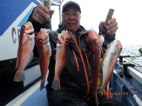 竿頭22匹 メダイ サバ アマダイ キダイ ホウボウ イネゴチ フラッシャーサビキ五目のクロムツ~アマダイ五目のリレーへ出船。 Fサビキ五目は、久しぶりにエサ反応濃く、良型クロムツ多く、ポツポツと順調に釣れました。多点掛けは少なかったですが、ダブル連チャンの方もいて、トップは22匹。次いで16匹。型が良いので満足です。手返し仕掛けで差ができました。エサ反応良くなってクロムツ上向き傾向。良い外道反応はバリバリでした。入れ食いで途中で止められてしまう感じでしたが型は交じりでした。他にメダイ・サバ交じって好調! 後半のアマダイ五目は、潮の流れ速く、二枚潮で苦戦。小型アマダイ・キダイ大中小型・ホウボウ・イネゴチなど。