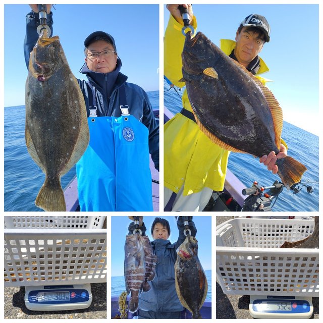 1.80~3.10kg 0~2匹 マハタ 0.60~1.30kg 0~3匹 カサゴ マトウダイ ★朝は寒く日中は過ごしやすい1日。 今日も大鮃狙いで深場にGO。 潮方悪く当たりイマイチ…。 そんな中〜良型ヒラメ&マハタを釣り良いお土産に…なった方もチラホラ。 皆さんお疲れ様でした。 ※ヒラメ釣りも残り6日🈳まだ有り、 お電話お待ちしています。