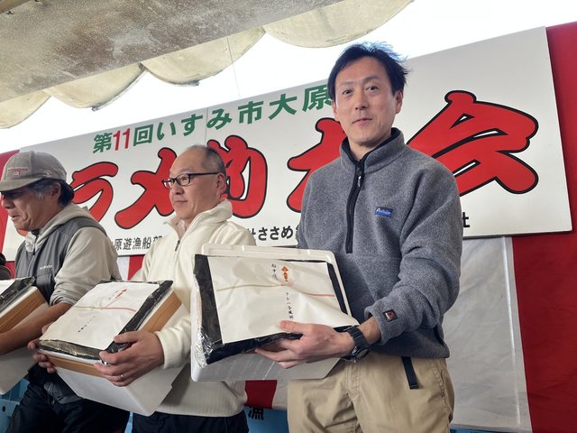 第11回いすみ市大原港ヒラメ釣り大会。 結果発表! 天気も良く、一日穏やかな釣り日和。 しかし風も無く、流れも無い厳しい。 唯一、、イワシの群れは有り。 一発大ビラ勝負の一日となりました、 最初は港口からスタート。 早掛賞は、伊藤様おめでとう御座います。 そして、朝一大型が掛けるもお祭りでバラシ…。 その後にやっと1枚。 潮が澄んでいたので、太東沖に移動、、、 2.5k級の良型をキャッチ!佐藤様! 今日一と思いきやポイント移動後にポンポン良型が増えて、最後のポイントでも本日竿頭に粒人様、3枚目キャッチ。 これで時間切れとなってしまいました。 結果は…惜しくも総合入賞ギリ出来ませんでしたが、総合4位で4.26k。 船内優勝は森様おめでとう御座います! 今年も大勢のお客様にご乗船頂きありがとうございました。 事故も無く、無事に終了出来ました。 皆様に感謝、感謝です。又次回も宜しくお願い致します。