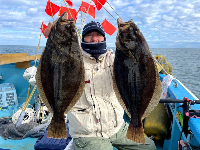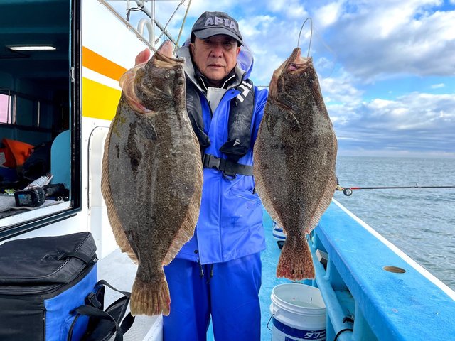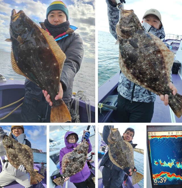 「ヒラメ専門」★前半流れ無く。船長の嘆きのLINEが…。 でも!後半少し潮流れだし大鮃・良型交じりにポツポツ釣れました。 寒い中〜皆さんお疲れ様でした。 只今、午後のマダイに出船中。 明日は今年ラストのヒラメ釣り。 踏ん張って行きます。