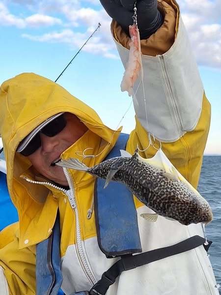 (ショウサイフグ)23~36cm 0~11匹 午前船。ふぐ船は水深21〜25m。 海が悪く釣り辛く反応も探せず前半苦戦したが、後半は流すたびに当たりはあり型がありました。海況良ければまた期待。澄み。