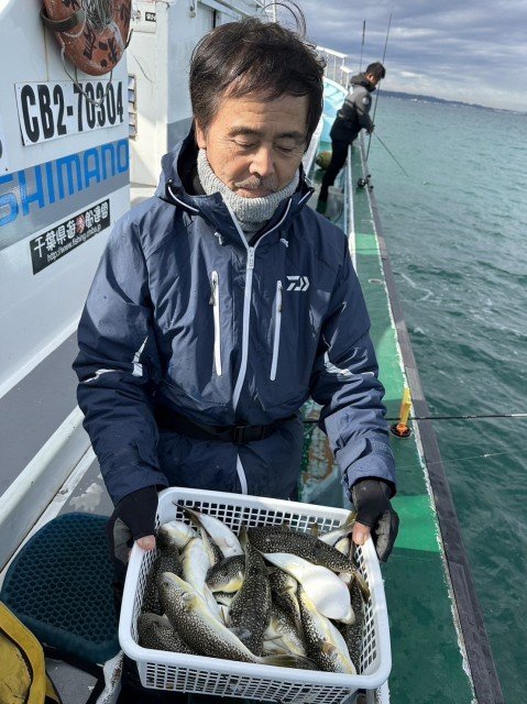 (ショウサイフグ)23~38cm 2~8匹 午前船。 ふぐ船は水深20〜25m。風強く、釣り辛く型程度でしたが、良型主体でした。