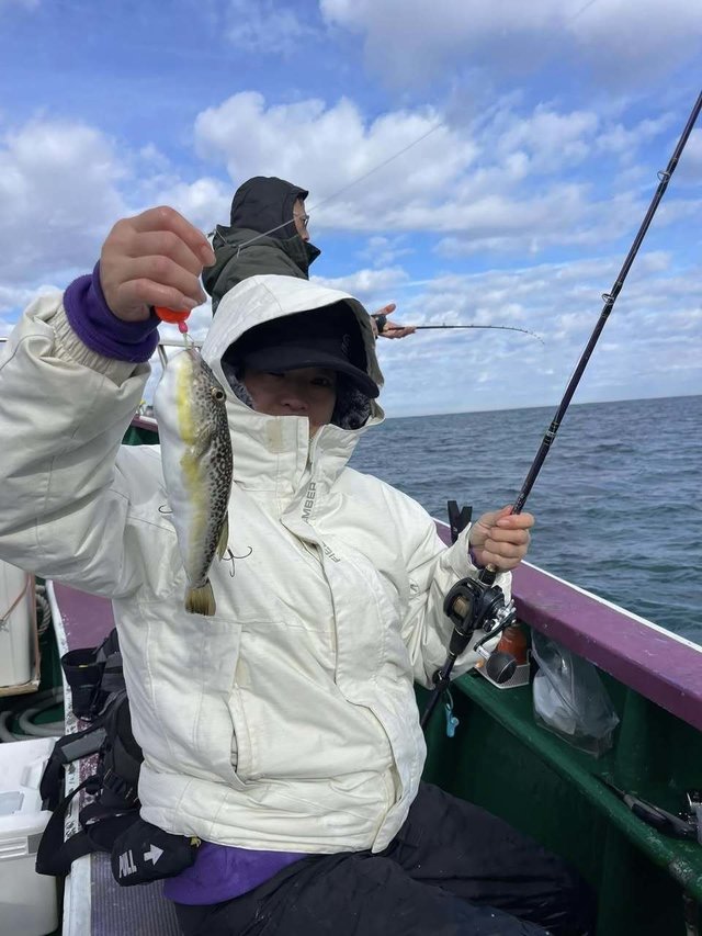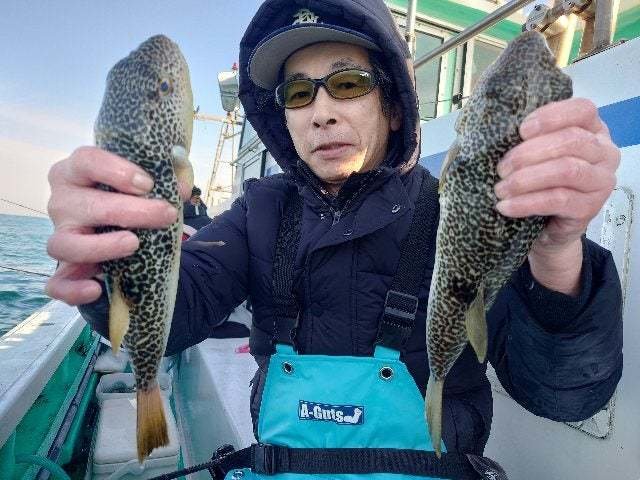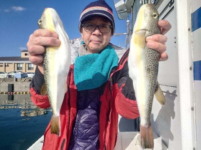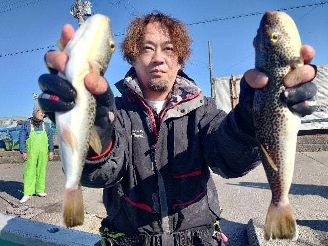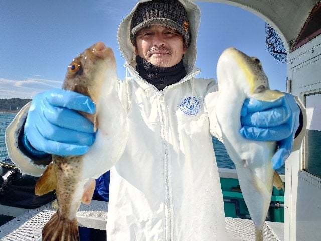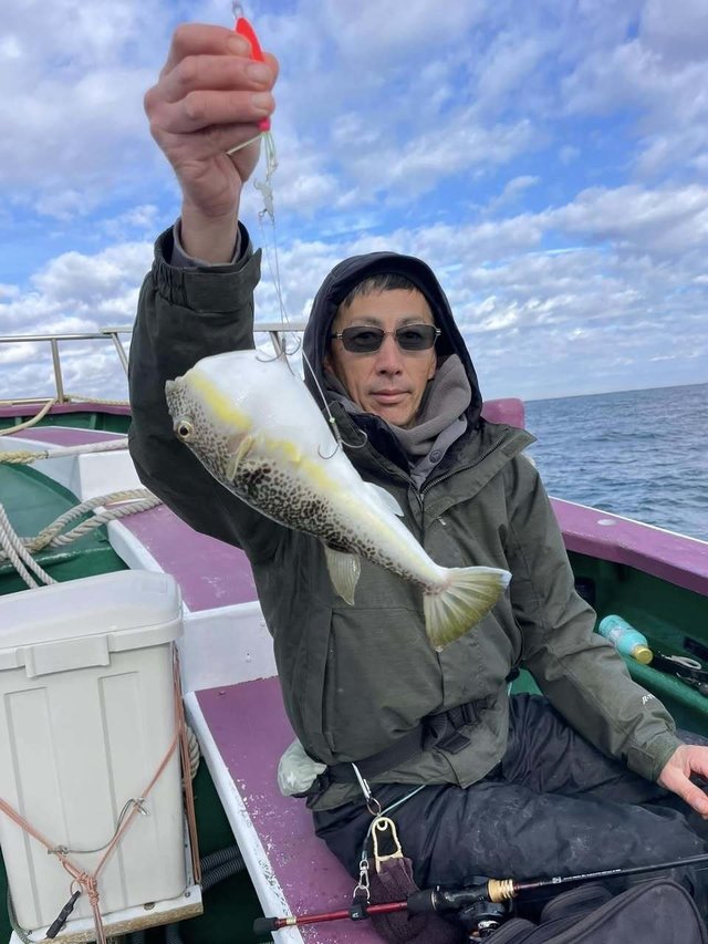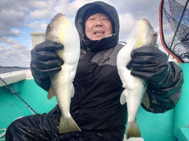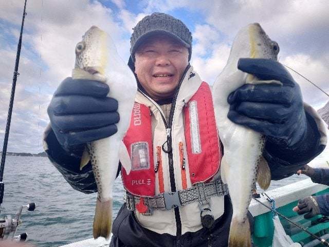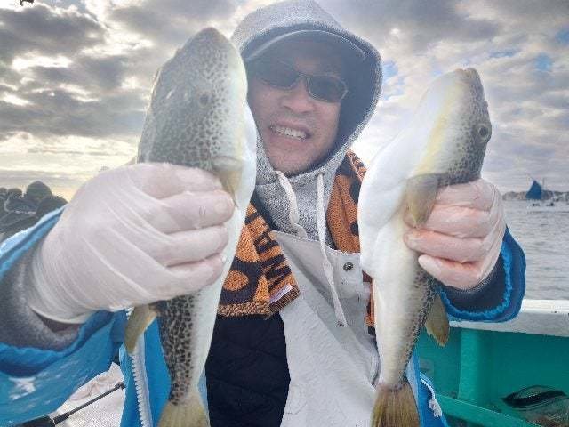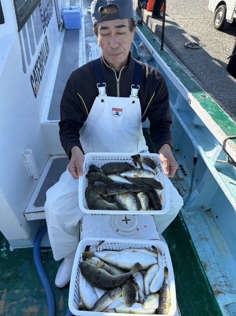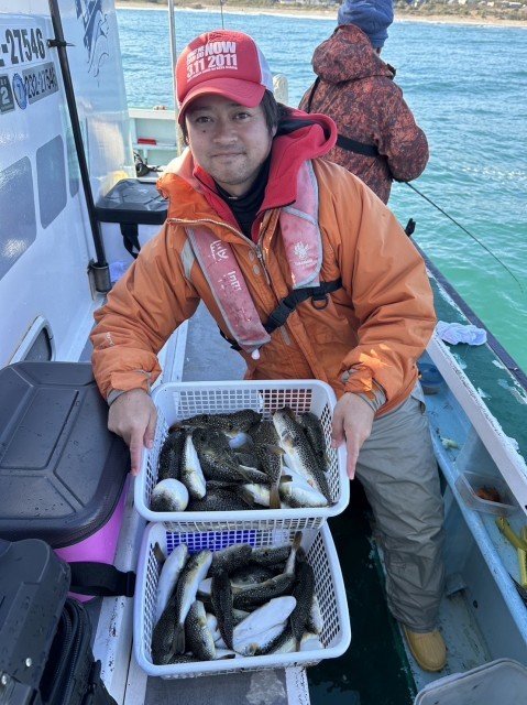 (ショウサイフグ)23~38cm 1~6匹 ふぐ船は水深24〜30m。 朝からトラフグも混じり、良型主体で型見れたが、日中、食いが続かず苦戦。