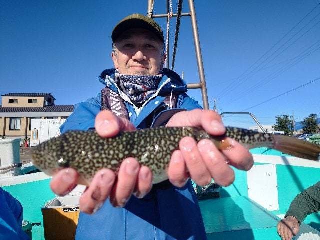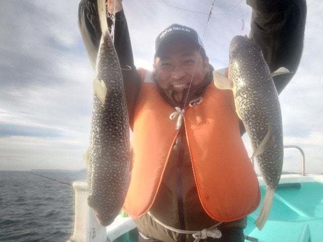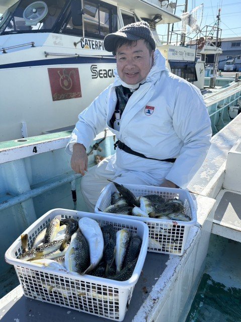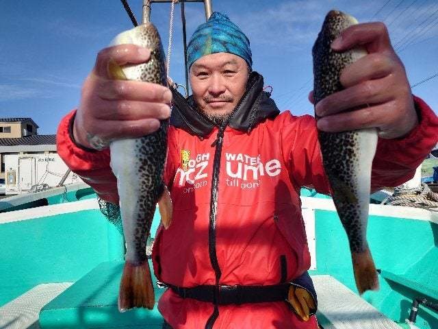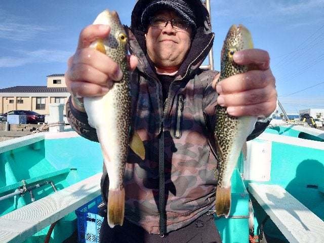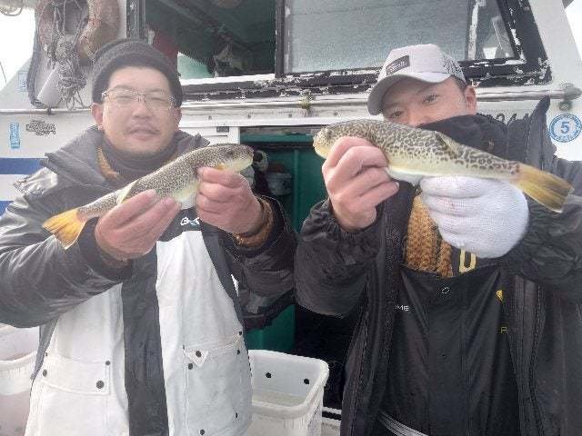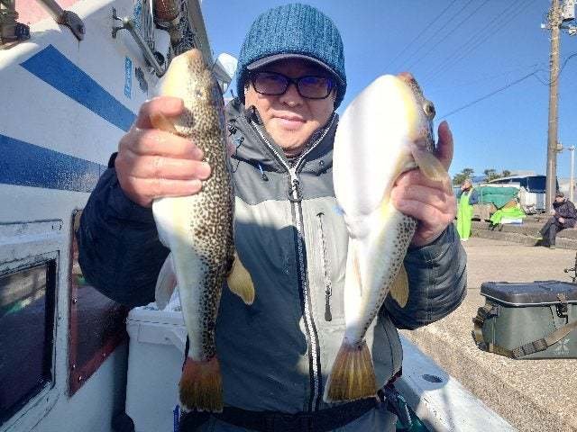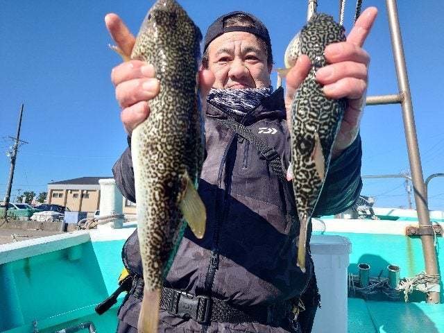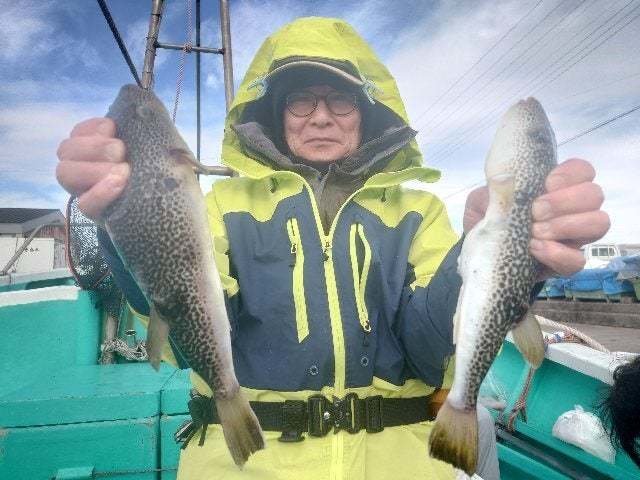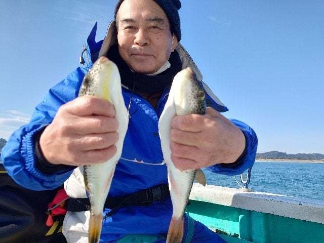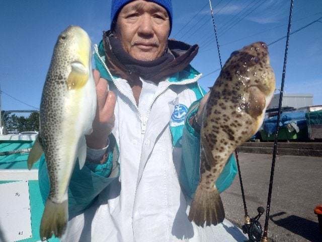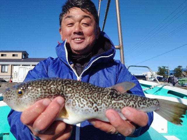 (ショウサイフグ)23~38cm 1~6匹 ふぐ船は水深24〜30m。 朝からトラフグも混じり、良型主体で型見れたが、日中、食いが続かず苦戦。