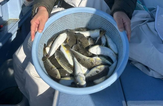 (ショウサイフグ)23~38cm 9~23匹 ふぐ船は水深30m前後。 朝一から良型も混じりながら型があり、日中も流す度に釣れ好調に釣れました。澄み気味。