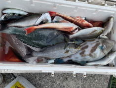 (マアジ)クロムツ メダイ スミヤキ オアカムロ サバ マダイ イサキ ハナダイ カイワリ キントキ キダイ ホウボウ キントキ カイワリ オニカサゴ カサゴ シイラ メジナ ウマヅラハギ マハタ 黒ムツ・五目で満船で出船有難うございました<(__)>朝から黒ムツは釣れ、後半良型活発で、まだ釣れていたけど時間で、美味しいお魚釣りに・・・こちらも多点掛け連発。前半でしっかりお土産出来ました。他メダイ・スミヤキ・オアカムロアジ・アジ・さば。 後半はコマセ五目で、マダイから入りましたが気配なく五目釣りへ・・・マハタやイサキ・ハナダイ・キダイ・ホウボウ・キントキ・カイワリ・沖アジ・オニカサゴ・カサゴ・シイラ・メジナ・ウマヅラハギ等多彩です(#^.^#)ちょっと小型のお魚多く残念(T_T)