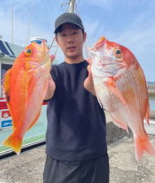 (マアジ)クロムツ 竿頭20匹 サバ メダイ アマダイ 最大50cm 0~2匹 キダイ フラッシャーサビキ五目のクロムツ~アマダイ五目のリレーへ出船。 Fサビキ五目は、良型クロムツがポツポツポツポツポツ・・・と、派手な食いはなかったですが、常に誰かしらあげてる感じで、次第に食いも良くなり、ダブル・トリプルもあり、大型も交じって好調でした。5匹釣れれば満足サイズをトップは20匹ちょい。10匹以上釣ってる方多数。他にアジ・サバ・メダイ・良い外道。 後半のアマダイ五目は、アマダイ・キダイでほぼ入れ食い。アマダイは最大は50㎝ジャンストのジャンボ・他も大型多く0~2匹。キダイは大中小型交じりでしたが、良型多かった。