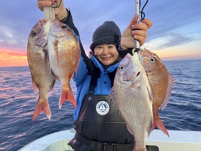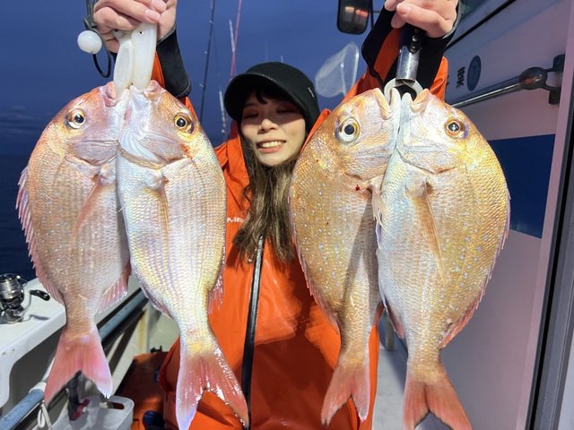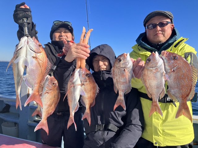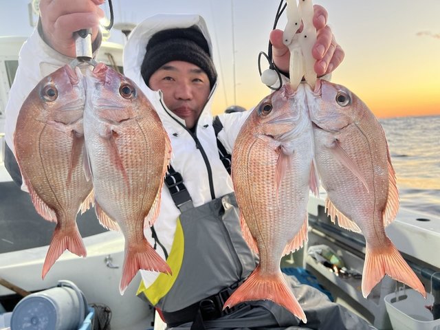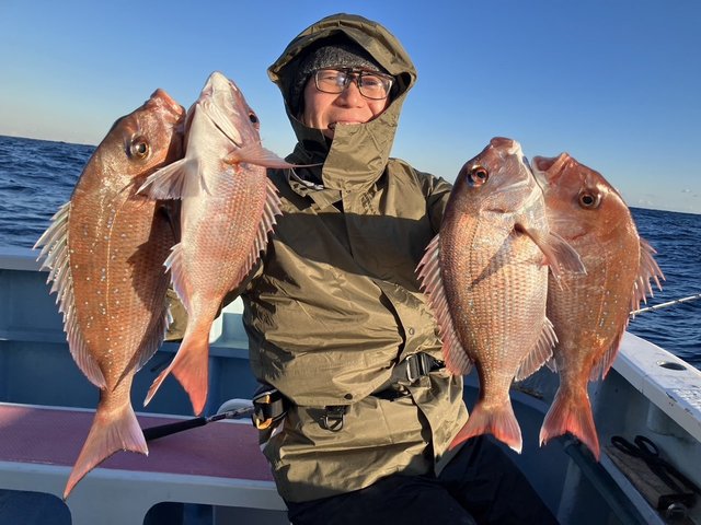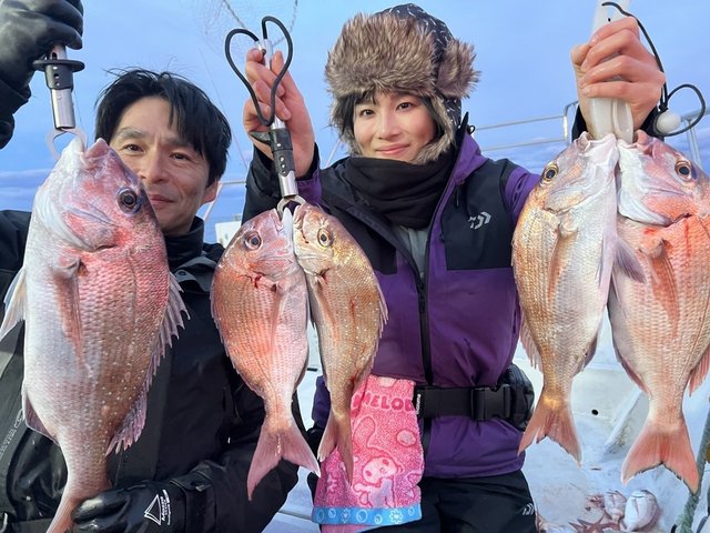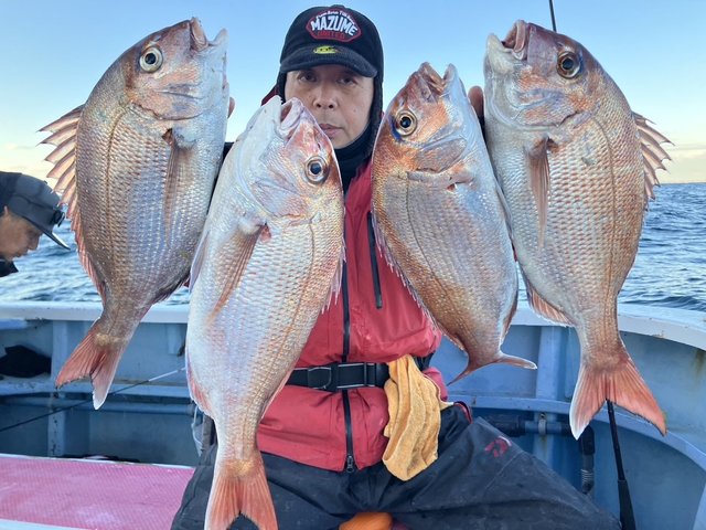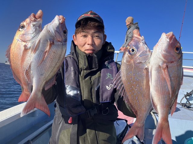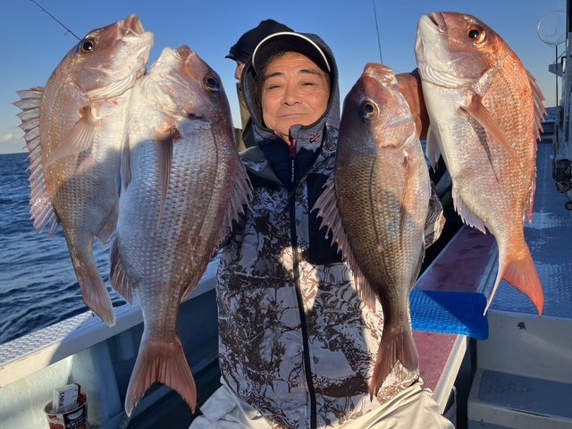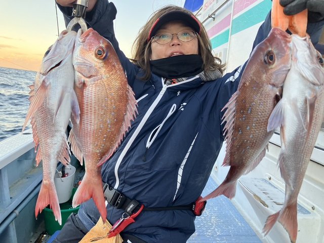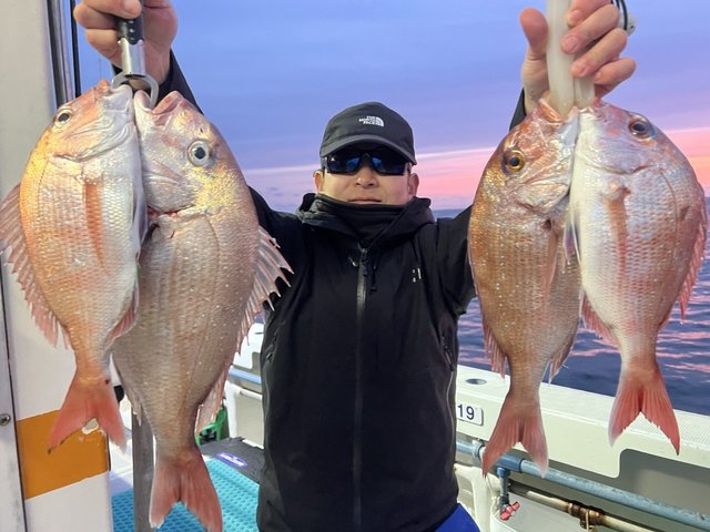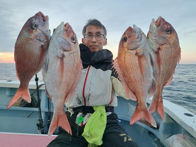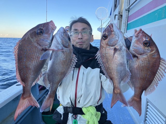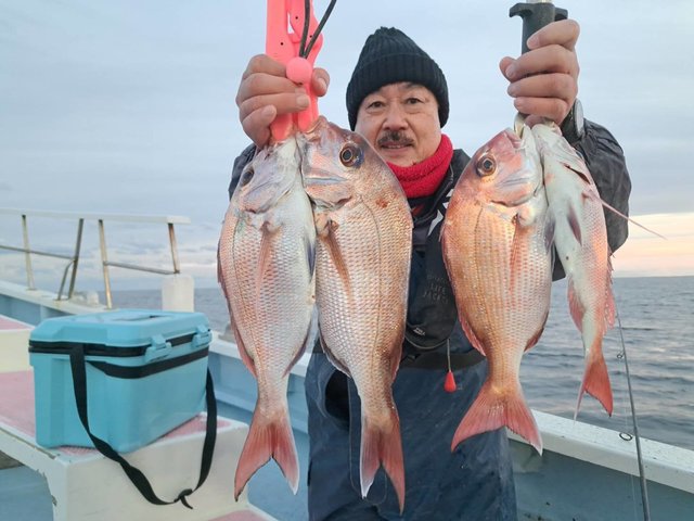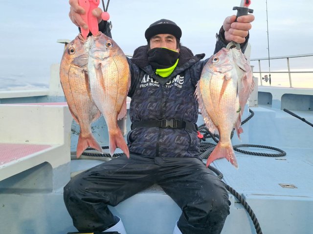 0.30~1.00kg 0~16匹 マダイ 0.40~1.00kg 2~21匹 ★★★活き海老エサでの一つテンヤマダイ釣り♪★★★ 活きエビエサは、こちらで準備しております。 エサの追加料金は頂いておりません。 (準備できない場合は冷凍エビとなります。) テンヤはご用意をお願い致します。 <マダイ船1> 一つテンヤでのマダイ釣りです。反応多く、入れパク!…とはいきませんでしたが、コンスタントに型が見られ、多彩な外道混じりで皆さんお土産になりました。 外道:ハナダイ、カサゴ、ウマヅラ、オオニベ、マハタ、メバル、イナダ、カワハギ。 <マダイ船2> 一つテンヤでのマダイ釣りです。本日は反応広範囲に有り真鯛の活性良くTOP21匹。2番手20匹2名、次15匹2名。8割以上の方が10匹以上と絶好調!!平均サイズも良く皆さん楽しめました。明日また頑張ります。 外道:ハナダイ、オオニベ、カサゴ、カワハギ、イシダイ、イナダ。 ***キャビン内、店内はマスクの持参着用をご協力お願い致します*** <今後の予定>***集合時間まえにはお越しください。 午前船:4時30分船宿集合…マダイ船、ヒラメ船。 午後船:10時30分船宿集合…マダイ船。 定休日:第2火曜日(1/14) (*状況により予定が変わることもございます。前日に確認のお電話をお願い致します。) <ご予約・お問い合わせはこちらへ> 090-2155-0500(午前9:00~午後8:00まで) キャンセルにより他のお客様へご迷惑をおかけしてしまう事もありますので、キャンセルの無いようご予約をお願い致します。 <乗船名簿について> ①お名前(フルネーム)、②住所、③緊急連絡先の電話番号、④年齢、⑤性別 ①~⑤まで記入し可能であれば、持参お願い致します。