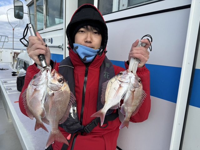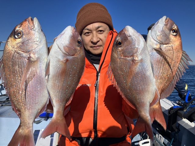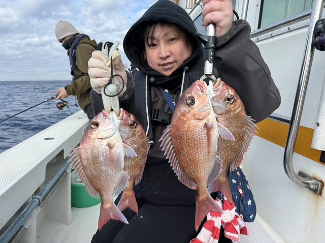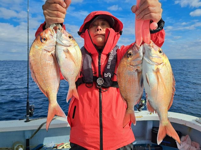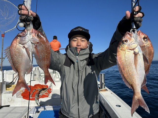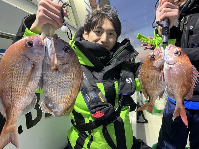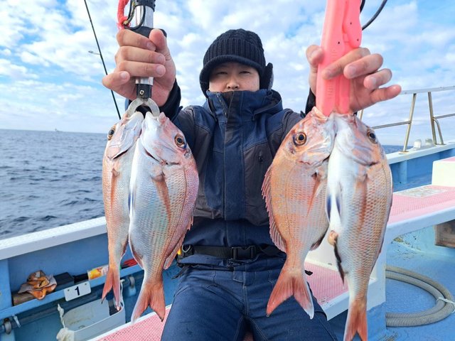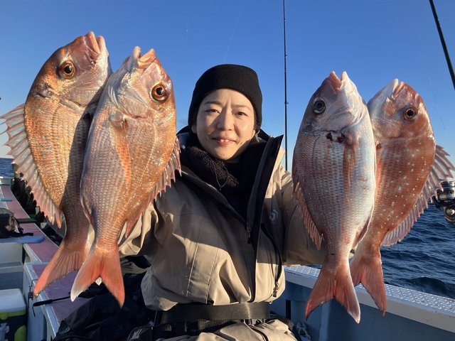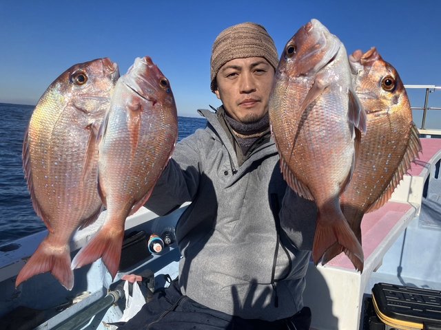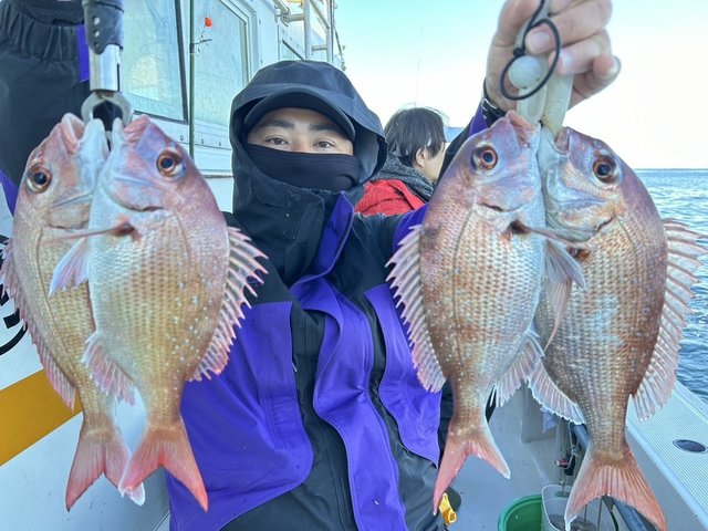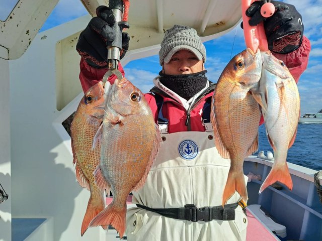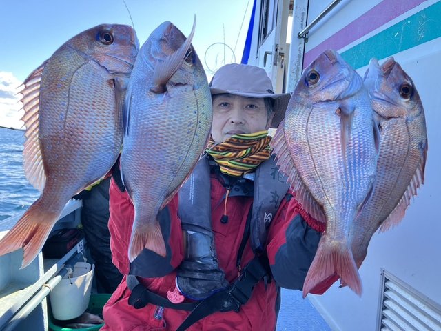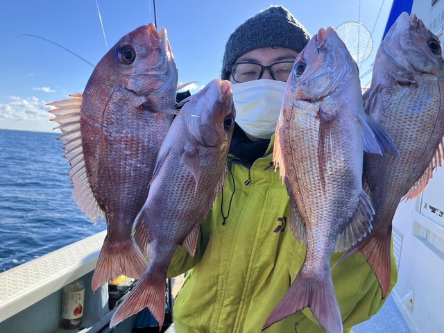 0.30~1.20kg 1~18匹 マダイ 0.40~1.00kg 3~16匹 ★★★活き海老エサでの一つテンヤマダイ釣り♪★★★ 活きエビエサは、こちらで準備しております。 エサの追加料金は頂いておりません。 (準備できない場合は冷凍エビとなります。) テンヤはご用意をお願い致します。 <午後マダイ船1> 一つテンヤでのマダイ釣りです。反応の割には活性イマイチながらも、TOP18匹、次いで15匹、14匹、13匹と上手に掛けている方もおりました!5.0kgオーバーのイシダイやカワハギ等の嬉しいゲストも上がり良かったです。 外道:ハナダイ、カサゴ、ウマヅラ、オオニベ、マハタ、イナダ、カワハギ、イシダイ。 <午後マダイ船2> 一つテンヤでのマダイ釣りです。午後からはウネリが出てしまった為か反応まとまらず色々ポイントを変えて見ました。活性上がらずポツポツ程度でしたが、オデコ無く良かったです。明日また頑張ります。 外道:ハナダイ、オオニベ、カサゴ、イシダイ、メバル。 ***キャビン内、店内はマスクの持参着用をご協力お願い致します*** <今後の予定>***集合時間まえにはお越しください。 午前船:4時30分船宿集合…マダイ船、ヒラメ船。 午後船:10時30分船宿集合…マダイ船。 定休日:第2火曜日(1/14) (*状況により予定が変わることもございます。前日に確認のお電話をお願い致します。) <ご予約・お問い合わせはこちらへ> 090-2155-0500(午前9:00~午後8:00まで) キャンセルにより他のお客様へご迷惑をおかけしてしまう事もありますので、キャンセルの無いようご予約をお願い致します。 <乗船名簿について> ①お名前(フルネーム)、②住所、③緊急連絡先の電話番号、④年齢、⑤性別 ①~⑤まで記入し可能であれば、持参お願い致します。