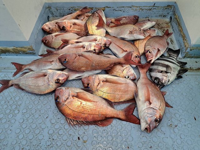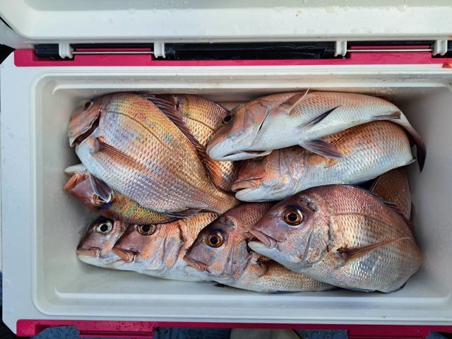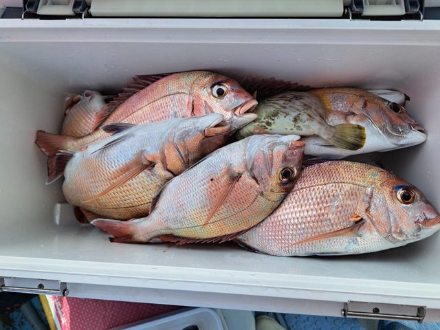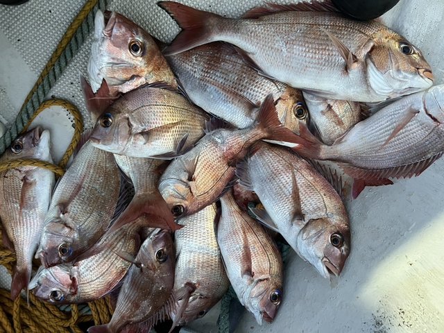 ハナダイ 20~38cm 1~8匹 メバル ウマヅラ コマセ五目です。今日は反応良いが、その反応が船から逃げ回って大苦戦となってしまいました。 上がれば良型ハナダイなのでなんとも悔しい‼️シャクリが楽しいコマセハナダイ五目‼️ 誘って誘ってジャンボハナダイを狙いましょう。 コマセカゴFL60号。 ウイリー3〜4本針。 ハリス2〜3号。 クッションゴム1.2mm20cm。 本日もありがとうございました‼️ 次回のご乗船もお待ち致しております。