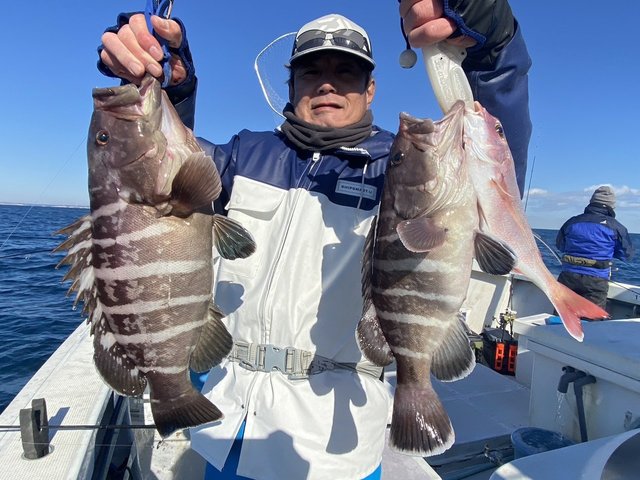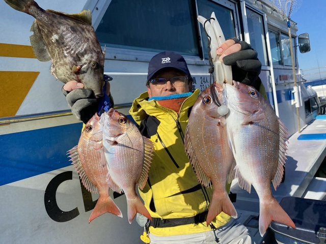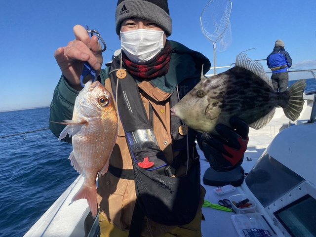 0.30~1.00kg 0~12匹 マダイ 0.30~0.80kg 2~10匹 ★★★活きエビでの一つテンヤマダイ釣り♪★★★ (活き海老エサが準備できない場合は冷凍海老での釣行になります。) エサは、こちらで準備しております。 エサの追加料金は頂いておりません。 <マダイ船1> 一つテンヤでのマダイ釣りです。反応のわりに活性はいまひとつで、型は出るけど中々伸びず~な状況でしたが、ポイント移動後はマハタやカワハギなど嬉しい外道も混じり良いお土産になりました♪ 外道:ハナダイ、カサゴ、ウマヅラ、タカノハダイ、カワハギ、マハタ。 <マダイ船2> 一つテンヤでのマダイ釣りです。広範囲に反応あるが真鯛の活性上がらず今一つでした。それでもオデコ無く良かったです。次回また頑張ります。 外道:ハナダイ、カサゴ、カワハギ、イシダイ。 ***キャビン内、店内はマスクの持参着用をご協力お願い致します*** <今後の予定>***集合時間まえにはお越しください。 午前船:4時30分船宿集合…マダイ船。 午後船:10時30分船宿集合…マダイ船。 定休日:第2火曜日(1/13) (土、日、祝日は、貸竿のお客様、貸竿の必要なグループ様は5分前集合でお願い致します。) (*状況により予定が変わることもございます。前日に確認のお電話をお願い致します。) <ご予約・お問い合わせはこちらへ> 090-2155-0500(午前9:00~午後8:00まで) キャンセルにより他のお客様へご迷惑をおかけしてしまう事もありますので、キャンセルの無いようご予約をお願い致します。 <乗船名簿について> ①お名前(フルネーム)、②住所、③緊急連絡先の電話番号、④年齢、⑤性別 ①~⑤まで記入し可能であれば、持参お願い致します。