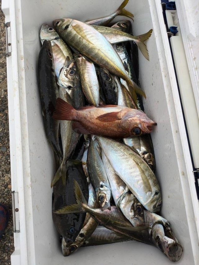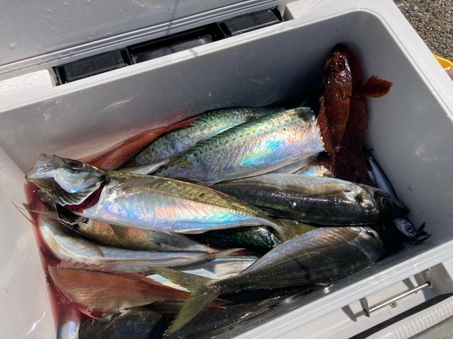 (ゴマサバ)ハナダイ 18~37cm 0~27匹 アジ 16~32cm 0~10匹 カイワリ ウマヅラ ヒラソウダ 今日はお客様からのリクエストでLTハナダイで出船しました、 超久し振りのハナダイで、半分近くが貸竿のお客様だったし、 未だウネリの有る状況だったので、 不安いっぱいのへっぽこ船頭でしたが、 第1投目からアタリが有ったと思ったら小さいハナダイ、 他にも多々アタリが出てると思ったら小アジが釣れて、 その後反応が大きく成ったと思ったら小鯖でしたが、 どうしたものか、悩んでいるうちに中型のハナダイが混じり、 我慢してみたら、中型がたまに混じってサイズ色々になり、 35㎝級のハナダイや30㎝オーバーのアジも釣れる様になった、 中盤にポイントを移動してみたらダメダメで空振り続き、 終盤は朝のポイントに戻ってみたら、 アタリ回復していて、船酔いで寝てしまった人以外はお土産十分。