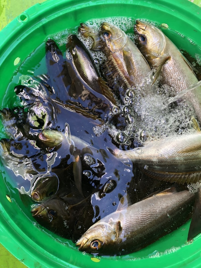 (マアジ)15~37cm 14~30匹 イサキ 23~38cm 15~50匹 潮濁り水温高く朝から入れ食いです後半アジ狙入れ食いです