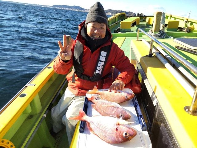 (ブリ)マダイ 0.50~3.30kg 1~6匹 アジ サバ クロダイ 横浜沖の近場ポイントを回り、今日は高活性の当たり日でした。 トップ6枚、二番手5枚で5名様が複数ゲット。 ご乗船の皆さんが型見れました。こんな日は当たりが多く、中~大アジも皆さん釣れて、他に皆さん欲しがるサバやイナダ、黒ダイが交じりました。ご予約お待ちしてます。