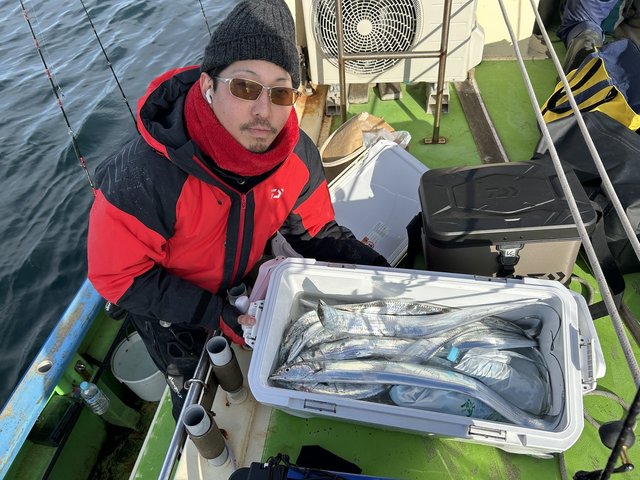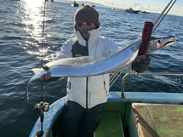 65~124cm 12~44匹 ショートタチウオ船。本日2025年初出船致しました。 2日間空きましたが、太刀魚さん心配ご無用でした! 新年初釣りも言う事なしの超絶高活性!! 1日通して天秤、テンヤ共に入れアタリ~食いっぱなし! 天秤、テンヤ初挑戦、初心者の方々も含めまして総員10抜け達成で約半数名が20本以上!トップはダントツで!! 皆様クーラー満タンでお土産バッチリ過ぎました~