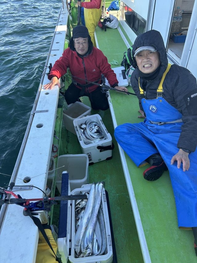 75~110cm 8~38匹 ショートフィッシング・天秤タチウオ乗合船。船中総数325本/16名様。本日も『タチウオ冬の陣開催中!』に合流です♪♪ 仕掛けの針サイズは2/0のノーマル仕掛けor逆テーパー仕掛け[低活性時は1/0推奨、高活性時は3/0でも可]で誘いのタチウオ釣りをしていただきました♪ 冬タチ本番の気難し~い誘いはほとんど必要なく、小魚に見立てて誘う誘う誘う~で比較的安易には遊んでいただけると思います。 棚は80m前後からだったり70m前後からだったり…。 チャカチャカちょいちょい誘う夏スタイルに近いけど~オモリガチャガチャとやりすぎるとダメ!な感じで上手くハマればお触り頻繁。 サイズは冬タチらしいプックリした釣り頃食べ頃な良型~中型主体に小型がタマに混じるかなーといった感じ♪サイズの個人割合はその日の運次第といったところです♪♪ 時間帯によってバクバクチャンスが訪れたり~気難しくなったり…な~んて様子で今日も一日みっちりと遊んでいただけました。 もう暫くは観音崎~走水海域に入ったお魚さん達で過ごせそうです。深場タックルをしっかり準備してきてくださいね♪ で、本日の本船最終結果は 38・34・27・25・25・21・21・21・20・18・18・15・12・12・10・8本。 今日も皆さんにはお土産確保完了で帰路についていただけました。 いよいよ『タチウオ冬の陣開催中!』ですね♪♪冬タチはいつ極限活性に落ちるか読めませんので、釣れてるうちの挑戦お待ちして居ります!!