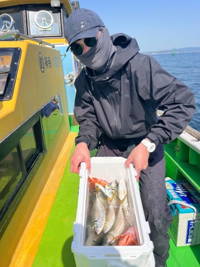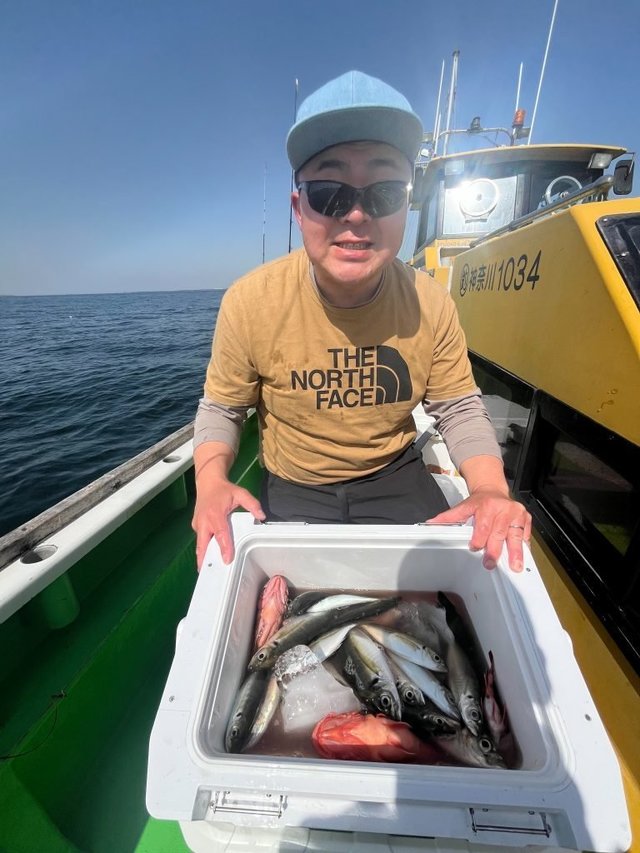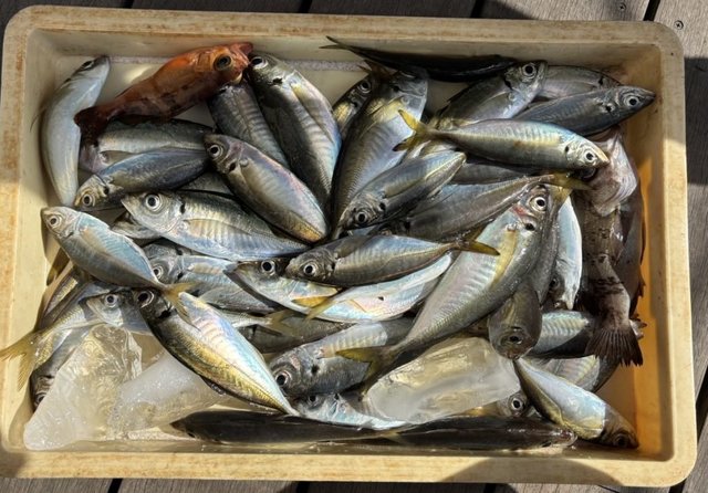アジ 16~29cm 5~20匹 クロダイ 合計2匹 イシモチ シロギス カイワリ 日はショートライトアジ船で出船しました。 朝はポツポツ 皆さん貸し竿で頑張ってくれました。