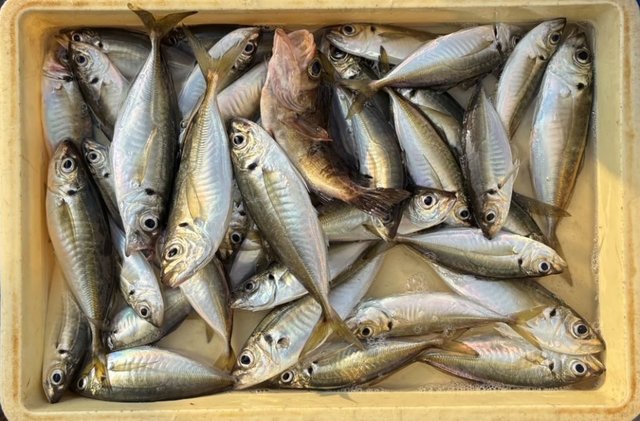 アジ 16~28cm 25~92匹 サバ クロダイ 午前アジ。外道サバ・カサゴ・クロダイ混じり。2隻の上下。トップは2人。