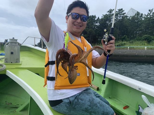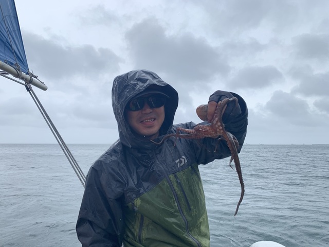 (マダコ)朝、エギタコ釣りで出船。 荒れ模様のベイエリア、風裏をじっくりコツコツとボトム探索。誘いのリズムがハマった感じでグッドサイズを短期間でサクサクキャッチ!お見事でした!!