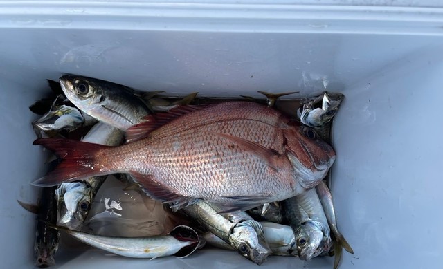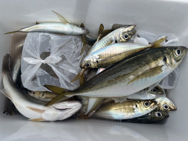 (マアジ)20~22cm 4~46匹 カサゴ イシモチ LTアジ。 午前は、数か所目でアタリ始め、前半は地味な釣れ方でしたが、その後はサービスタイムもあったので、おかず分は釣れてくれました。 午後は、波もあり釣り難かったですが、ポツリポツリと釣れ、皆さん楽しんで頂けました。 午後船、19~26cm、1~60尾。