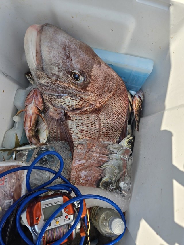 (マアジ)16~28cm 20~25匹 マダイ1枚(6.65kg)、クロダイ1(1.25kg)、カサゴ混じりでした。 暑さ対策は万全にお願いします。