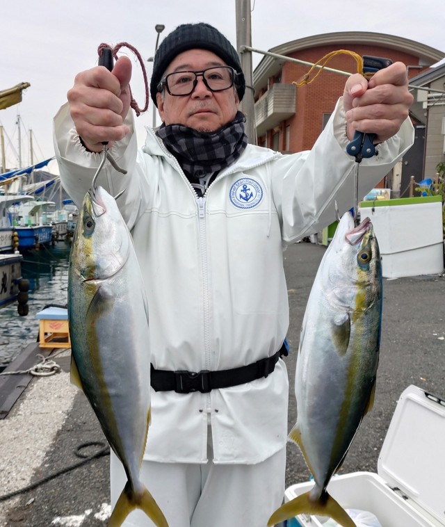 0.80~1.20kg 0~2匹 ワラサ 3.00~5.00kg 0~3匹 ワラサは良型多く、バラシも多数ありもったいなかっですが、皆様お土産になりトップ3本釣ることができ、1人だけバラシのみで型見れませんでした。マダイも混じりトップ2匹釣ることができました。ワラサ、マダイ狙いで出船しますので、ハリス4~8号を用意して下さい。26日、27日連休とさせていただきます。本日は寒い中ご乗船いただきありがとうございました。