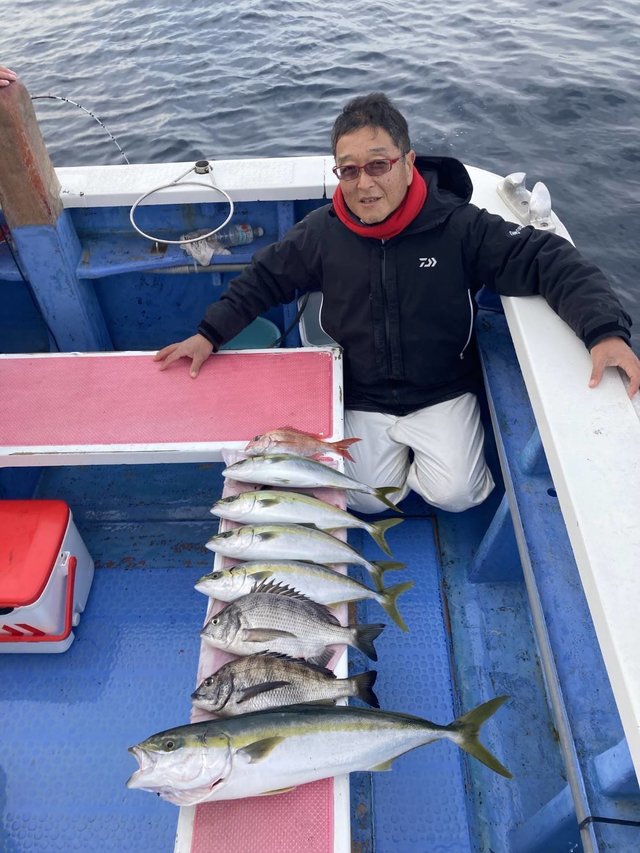 (ブリ)マダイ 0.80~2.00kg 0~4匹 カワハギ 16~25cm 0~9匹 クロダイ カンパチ アジ サバ キタマクラ マダイ船。 潮色と流れ:澄みゆるい。 風向きと強さ:北東ほどほど。 波高:0.5-1.0M。 別船カワハギ竿頭:佐藤さん。 あけましておめでとうございます! 今年もどうぞよろしくお願いいたしますm(__)m! 真鯛はトップ4枚、最大2kg! 真鯛釣り、深場で狙うと30cm超えの大型アジも釣れています。 水深40-50mでは真鯛だけでなく、カンパチや黒鯛、イナダなども食いついていて、後半の潮になるとサバの魚群も入り、サバも釣れています。 カワハギ釣り、トップ9枚! 早朝の剣崎沖は北風が強めでやや波あり。 城ヶ島沖の水深30-40mを中心に狙い、1流しに1-3枚ほどのカワハギが釣れて、一荷釣りのも数回あり。 12時が近づくとカワハギの活性は渋くなり、キタマクラが目立つような展開へ。後半は釣り場を転々としてカワハギをゲット。 リクエスト乗合の日程。 ・1月5日カワハギ乗合。 ・1月6日真鯛乗合。 ・1月7日アジの泳がせ。 ・1月11日真鯛乗合。 ・1月12日真鯛乗合。 ・1月13日真鯛乗合。 ・1月18日真鯛乗合。 ・1月19日真鯛乗合。