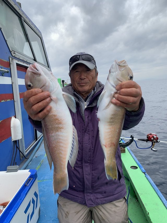 (アカアマダイ)20~40cm 2~7匹 レンコダイ ムシカレイ トラギス マダイ 最大0.80kg 0~1匹 イナダ イサキ カンコ アマダイ船。 潮色と流れ:濁りゆるい。 風向きと強さ:西強い。 波高:0.5-1.0M。 いつもご覧いただきありがとうございます! アマダイ釣りはトップ7枚、最大40cm! 皆さんが甘鯛を釣り、ヒットも続いて好釣でした(^^) 真鯛釣りは水深40-90mを狙い、水深40-50mにて真鯛・イナダ・イサキもヒット。 特にイナダの魚群も回遊中、魚群が船下に入ると1kgサイズが3本、4本、5本と掛かってきます。 リクエスト乗合の日程。 ・2月10日真鯛乗合。 ・2月12日アジの泳がせ乗合。 ・2月16日アジの泳がせ乗合。 ・2月22日あまだい乗合。