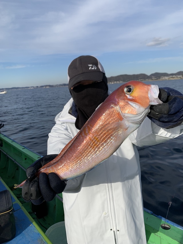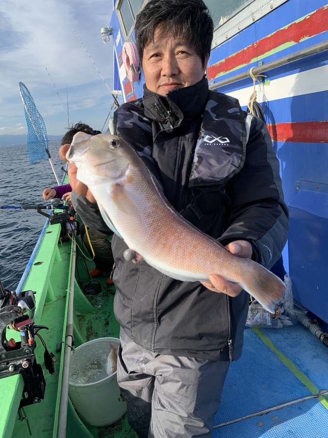 (アカアマダイ)0~5匹 今年最後の釣行も剣崎沖でした。潮色良く、水温も昨日より暖かかったので朝から船中ポツポツ釣れ、10時くらいで船中20本釣れていました。ですが、その後は上潮が濁り、二枚潮でペースダウンしてしまい、ポツリポツリのペースになってしまいましたね。中型主体で小型、良型混じりで最大39cmでした。竿頭は5本が3名様、梶原さん、塔本さん、波多野さん。次点4本が2名でした。