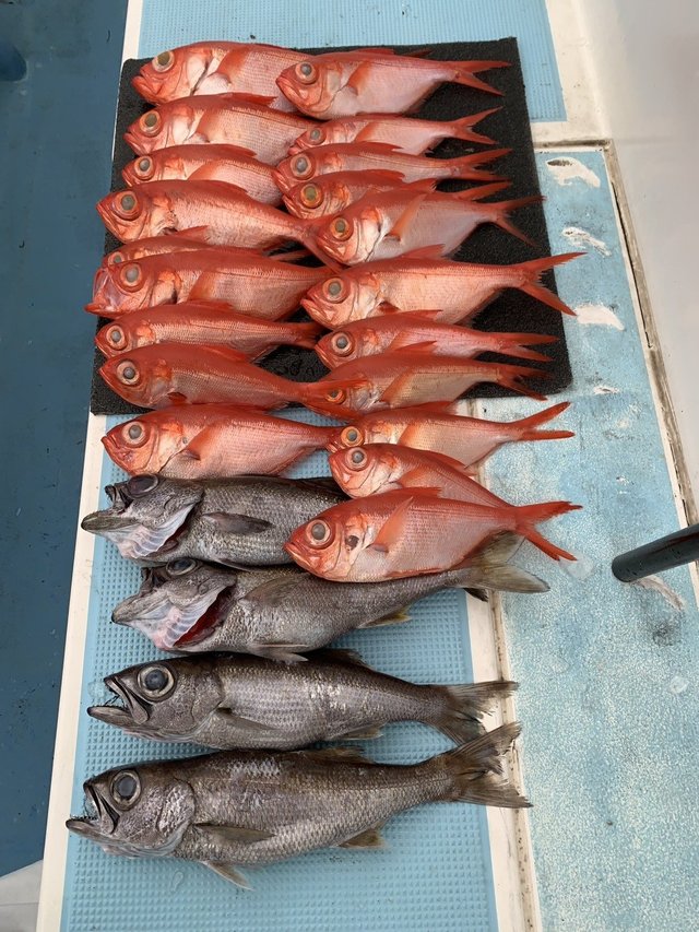 30~50cm 1~6匹 キンメ 28~42cm 2~23匹 今日18日は出船しました!1日ポツポツ当たり出て、皆さんキンメにクロムツ混じりで顔見れました!キンメ2~23枚28~42cm!クロムツ1~6尾35~50cm!他メダイにスミヤキに、深海デカサバが混じりました!潮流れも無く、釣りやすい状況が続いてます!是非チャレンジしてください!そして今日も、デカムツ2本浮上しました!今シーズンは、デカムツ浮上率がかなりたかくなっています。強めの当たりが出た時は、ドキドキしてくださいね。(笑)明日は定休日でお休みです!明後日金曜日のエントリーお待ちしてます!