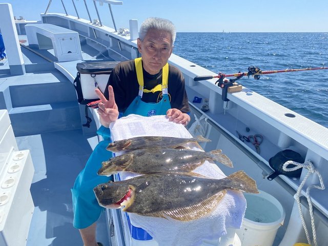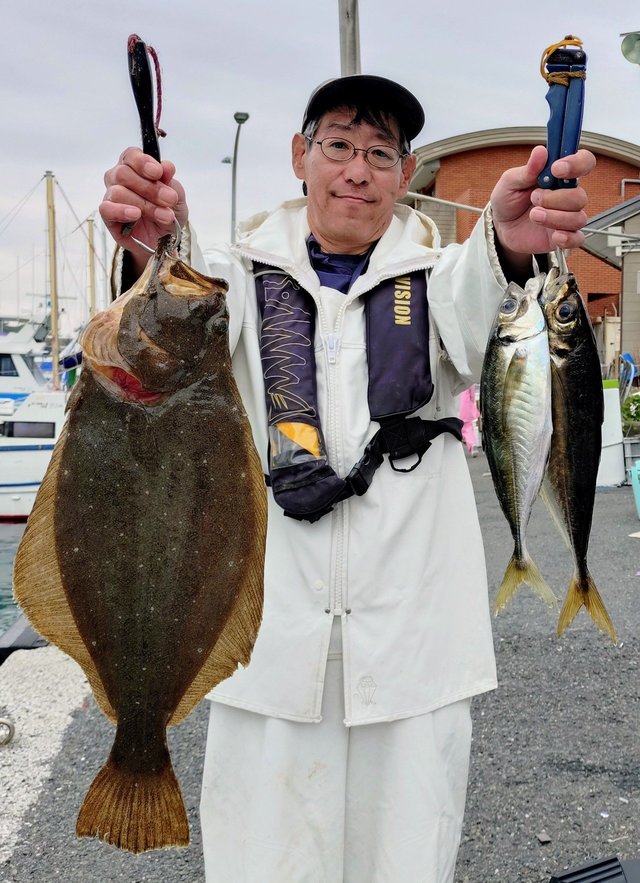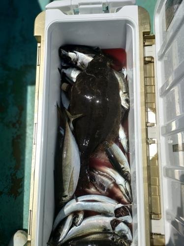 1.30kg 合計1匹 ワラサ 6.00kg 合計1匹 アジ 20~40cm 4~12匹 今日2日は朝から快晴で風は北の微風で海はベタ凪。絶好の釣り日和で出船する事が出来ました。明日も天気は曇りベースながら、風は引き続き北の微風でベタ凪予報ですから、釣行予定の方は安心してお出掛けになって下さい。 アジ五目船は今日も浅場の根回りで朝一落し込みから開始。ベイトの反応も青物反応も、しっかり出て来るのですが、今日はベイトの付きがイマイチで、中々ヒットせず、ワラサ6kg、ヒラメ1.3kgに、アカヤガラを何とか捕まえられましたが、明日からに期待って感じでした。 深場のアジも反応は出て来るのですが動き活発。デカアジ揃いで、連チャンで釣り上げて来る方もいらっしゃいましたが、釣果的にはもう少し頑張りたい所でした。 明日からまた気合入れて頑張ります。是非お出掛け下さい。