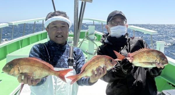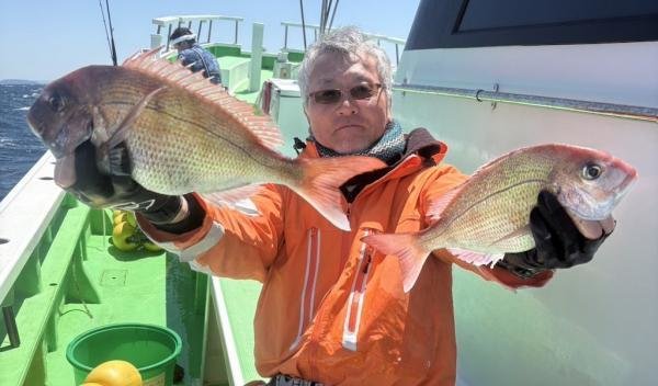1.00~1.30kg 0~1匹 イナダ 1.30~1.80kg 0~4匹 カンパチ 1.00~1.80kg 0~2匹 ワラサ 3.30~4.30kg 0~1匹 アジ 35~40cm 1~11匹 今日13日は、朝から雲ひとつ無い快晴。 風は北の微風から南の微風へと、まぁ“空気読んだように穏やか”に回ってくれて、海は終日ベタ凪。船頭としては「こういう日ばかり続いてくれよ…!」と海にお願いしたくなる、まさに絶好の釣り日和でした。 明日14日もこの好天が続く予報ですので、釣行予定の皆さまは安心してお出掛け下さい。 アジ五目船、マグロ・カツオ船ともに出船しますよ。 --- ■アジ五目船 まずは朝イチ恒例、落し込みからスタート。 昨日はサバ軍団に行く手を阻まれ、ベイトが中々付かず苦戦しましたが、今日は違いました。朝からアジのベイトがほどよく当たり、最初は“ベイトのアジを釣ってるのか、本命を釣ってるのか分からん状態でしたが、でもそこは自然相手、しばらくすると潮が変わったのか、 まずはイナダが姿を見せてくれ、その後ポツリとカンパチ。 さらにイナダがあちこちで当たり始めてくれました。 そして本日の主役(?)ワラサはというと―― とにかくバラシ、ハリス切れ、ハリ外れの三拍子オンパレード。 「船に上がるまでが釣りですから!」と言いたい気持ちを抑えつつ見守っていたのですが、ようやく中盤以降に2本確保!6打数2安打は残念。 その後も何とか皆さんにチャンスが巡り、多くの方がワラサ・イナダ・カンパチの“青物三種盛り”を手に出来ました。 反応はとにかくデカい! 時合さえハマればまだまだ狙えますので、明日以降も期待大です。 --- ■深場へ移動してデカアジ狙い 後半は深場へ移動してアンドンビシでデカアジ狙い。 最初のポイントはスカ…完全にかわされました。 「おいおい、さっきまでの勢いはどこに…」と苦笑いしていたのですが、次のポイントでは反応が大爆発。 仕掛けを下ろした瞬間、 ――いきなりデカアジの一荷(にか)! そこから短時間勝負となりましたが、サバの邪魔を上手く避けられる方はデカアジを連発し、“入れ食いモード”にも突入。 皆さん、何とかお土産を確保できたかと思います。 --- ■ご予約について 明日14日、明後日15日のアジ五目船はご予約受付終了となりました。 16日からはまた空いていますので ぜひ遊びに来てください。明日も精一杯頑張ります!