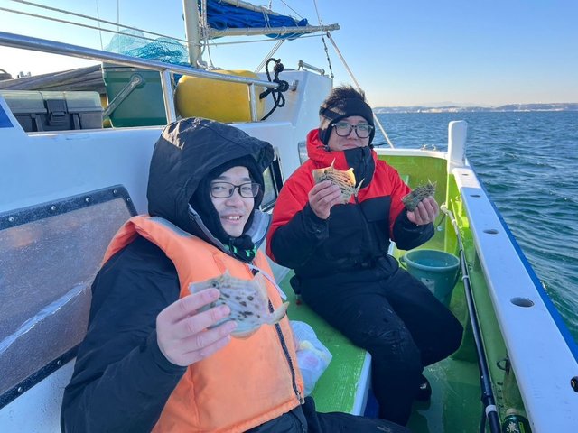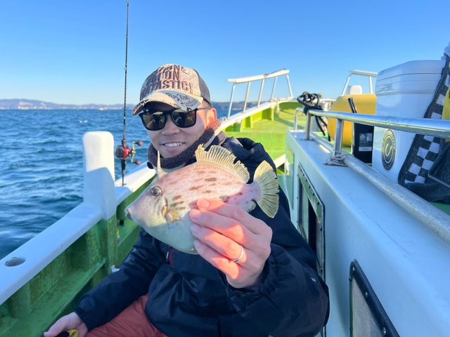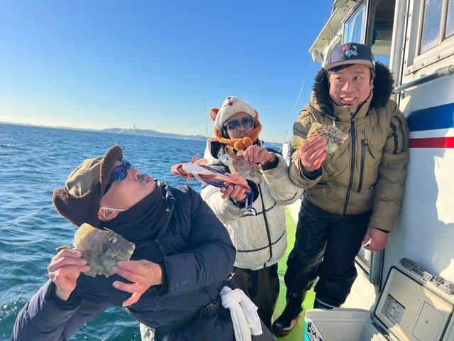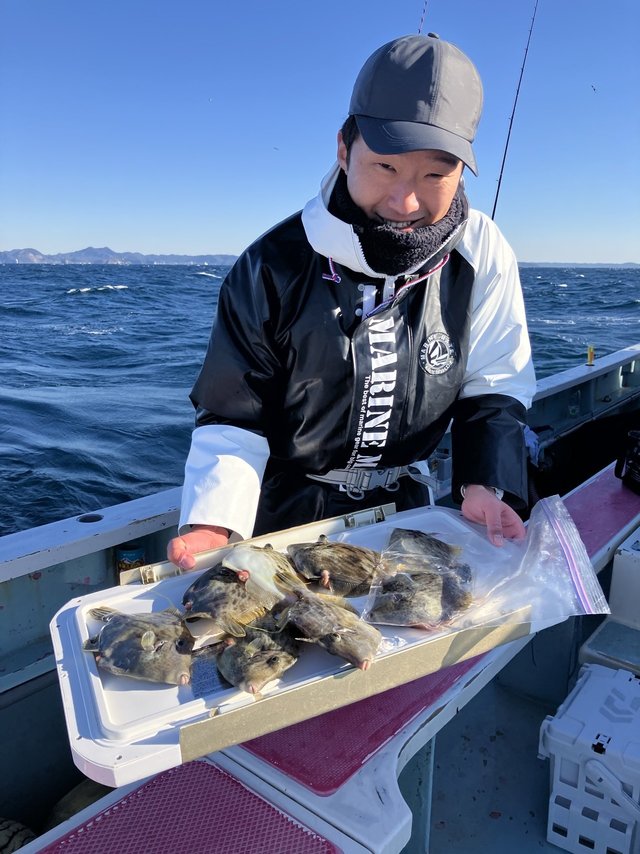 15~32cm 3~13匹 今日は前半戦は横波でやりずらく 冷たい北風に凍えた釣行でした。 私はカワハギ乗合船を 担当させて頂きました!!!!!! 朝イチは全然生体反応見つけられず ほぼエサが残ってくるような感じで 出船してから30分後に やっと船中で1尾目をゲット! 色は白く機嫌は悪くなさそう。 予報も少し外れて 太陽がなかなか出てくれず 分厚い雲に覆われて暗いし寒い。 波も横からぶつかってきて 船もドタバタしてやりにくい。 潮は何とか流れているのですが 全く定まってなく右へ左へ前へ後ろへ……。 11時前には城ヶ島へ。 水温も下がっていて17℃代だったので 基本は深みを探りました! すると少しずつ感じがいいカワハギを 見つけられるようになり フグに邪魔されながら 皆さん頑張ってくれて13時に 全員安打を達成。 ラッシュっぽいラッシュは あまりありませんでしたが 13時15分に出てしまいました!!!!!! 32.2cmのメガハギ!!!!!! それも漢気溢れる抜き上げを披露。 これには痺れました。 船内アナウンスで皆さんにサイズを報告すると 一気に戦闘モードになるのを感じました! すると一荷があったり パタパタっと連チャンゲットも! トップ13尾、次頭10尾、9尾(2名)……! 前回7尾だったお客様は10尾に! 5尾だったお客様は9尾と 数も少しずつ!1歩ずつ! ですが確実に増えています。 もちろん皆様の頑張りのおかげなのですが このいい雰囲気で年を越したいですね。 最近は剥きたての生アサリを使っているので アミノソルトは逆効果な場面も多いのですが 今日は曇り陽気で生体反応少なめだったので 良く効いてくれたようです。水色澄み。