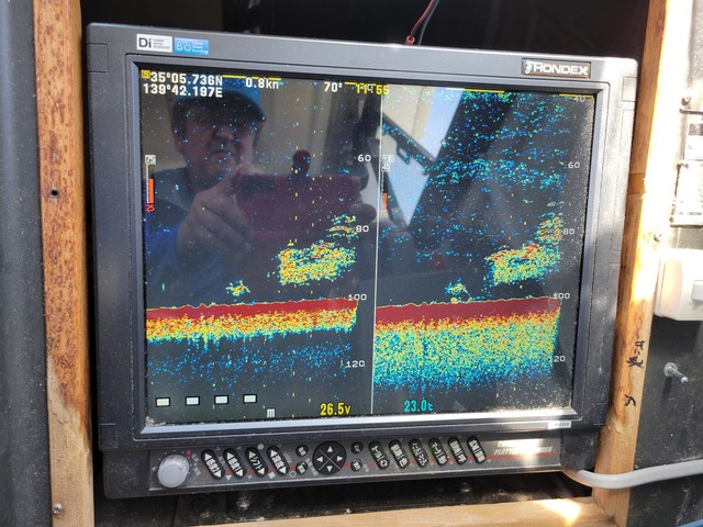 25~35cm 0~20匹 本日はナギ良く通常出船できました。 長井沖を軽く探索したのですが、全船が東へ直行のようでしたので後を追いました。 城ヶ島沖を越えてさらに東へ、先着の船の模様が芳しくありません。 エサの反応は見えるのですが、イカが混じっている感じではなく探索時間は長め。 城ヶ島沖の東口から剣崎沖の東の端までポイントは広く、各船が手分けして広範囲に探索しています。 もちろん昨日のヒットポイント付近も押さえましたが、全くの低調スタート。 各船が東へ西へと行ったり来たり、そんな時、三崎のブー船長がやや浅いラインで見つけました。 90m台に移動の速い群れが居て、追尾を繰り返しますが大群ではなくミート率は低め。 弱い前アタリを出すようですが、これを掴めないと・・・ しぶとく追いかけ、どうにか全員がお土産だけは確保?と安心したのですが、1名だけボウズだったようです。 ブランコ仕掛け使用の方も5~6杯づつは釣れたのですが、1名だけ型を見られなかった方は直結仕掛け使用。 難しい選択ですね、限られた釣行日に堅実にお土産確保を優先するならばブランコ仕掛けが無難でしょう。 今後ともイカ釣りを続ける中で、スキルアップのための直結仕掛けと割り切るのならば好適なシーズンではありますので、ご自身でご判断下さいませ。 どちらの仕掛けも攻略法に大きな区別はなく、くどいようですが仕掛けの落下時(フォールの動き)にもアタリは出ますし、イカの食い付き(反応)も良さそうです。 そんなアクションはブランコ仕掛けの方が出しやすかったりしますね。 そして活性の高い時以外のアタリは弱い事、竿先の動き、道糸の落ち具合やスプールから伝わるかすかな動き、そこに集中して僅かでも違和感を感じたら仕掛けの側にイカは居ると疑ってみる。 集中せず無造作に、ただシャクっているだけではアタリは判りませんよ。 イカが針(カンナ)に掛かってしまい、逃げようと引っ張り始めるのがアタリだと勘違いされている方が多いです。 明日もご予約頂き出船確定も空席多数、お連れ様募集です。 20日(金)、21日(土)、22日(日)もご予約頂いていますが、日曜日のご予約の方、土曜日に移して下さると助かります。 今の所の予報では22日(日)からは南風が強め?日本海に前線が停滞するような天気図が続き、梅雨もないのに梅雨明けのようなダラダラ南風が続きそうな気配ですね。