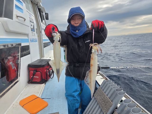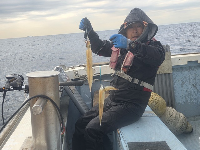 30~40cm 2~13匹 3名様一組乗船、予想以上に北東風が強く城ヶ島西沖に向けました。 ヤリイカの3~4杯掛けがあるなどポツリポツリ。 長井沖に戻りスルメ主体、両イカ半々でしょうか。 もう1名は10杯、手前マツリが多く苦戦しました。 明日もご予約頂き出船確定、15時現在2名様、お連れ様大募集です。
