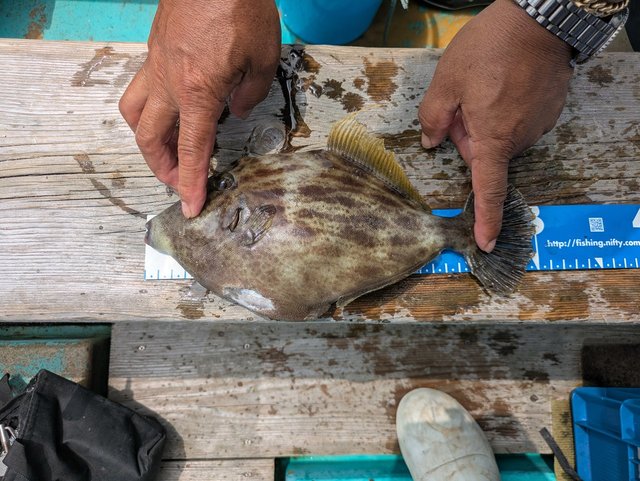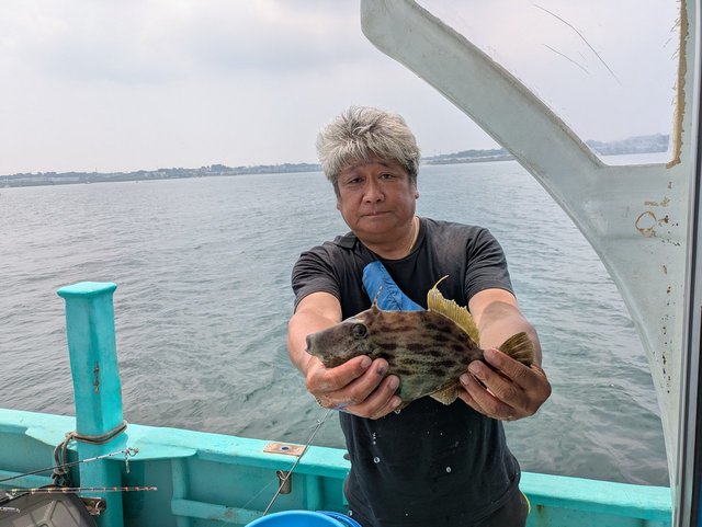 (マアジ)20~40cm 10~20匹 本日はアジ釣りからのシロギス釣りに出船しました。アジは大中小まじり安定の食いでした。大サバも釣れました。のちにシロギスは小田和湾で良型がたまに釣れましたが、難しい状況でした。猛暑の中、ありがとうございました。30センチのカワハギ釣れました。