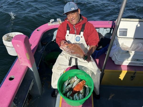 (マアジ)ワラサ 4.80~4.80kg 0~1匹 マダイ 0.50~1.00kg 0~1匹 今日は中潮、明日も中潮。 【泳がせ】開始から小アジのアタリは順調にヒットがあり、活き餌のたまりも良し。活き餌のかじられは何度かあり、ガブッとくるアタリ待ち。 アタリを待ちつつ徐々に強風のシケとなってしまうも、11時を過ぎた頃に4.8kgの良型ワラサの顔を見ることこができました。 【真鯛釣り】トップ1枚、最大1枚。最近は各真鯛場でフグの猛攻もあるため予備の仕掛けは複数枚、針の用意は1-2袋あると良さそうです。 海況: 潮色と流れ:薄濁、ゆるい。 風向きと強さ:南、弱い。 波高:0-0.5M→1.0-1.5M。