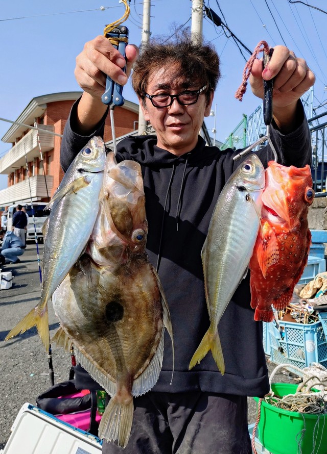 (マアジ)26~40cm 6~28匹 今日3日は朝から快晴で天気は文句無し。更に風も北から南の微風で朝のうち少しウネリはあったものの、それも次第に治まり海はベタ凪状態になりましたから、絶好の釣り日和で出船する事が出来ました。ただ、この時期は移動性の低気圧の影響で目まぐるしく陽気が変わっていきます。明日4日はまた風予報が悪くなっていますので全船休船になります。明後日5日は再び天気も風も回復してくれて、快晴&ベタ凪状態で出船出来そうですから、釣行予定の方は安心してお出掛けになって下さい。 アジ五目船2隻、根魚五目キンメ・クロムツ船で出船します。是非お出掛け下さい。 アジ五目船は何時もの浅場の根回りからスタートでした。今日は潮流れが速く、仕掛けを降ろすと「アリャ~~」って感じでしたけど、アジの当たりは活発で、一投目からデカアジは顔を出し始め、入れ食い状態で釣り始める方もいましたし、良型サバも交じりましたから、その盛り上がりで何とかお土産ゲット。その後城ヶ島沖でマハタ、カイワリ、マトウダイ、カンコ等など捕まえて最後は再び浅場で良型アジのプチ盛り上がりで納竿となりました。明日は休船になりますけど、明後日は通常通り出船しますから是非お出掛け下さい。アジ五目船2隻、根魚五目キンメ・クロムツ船で出船します。
