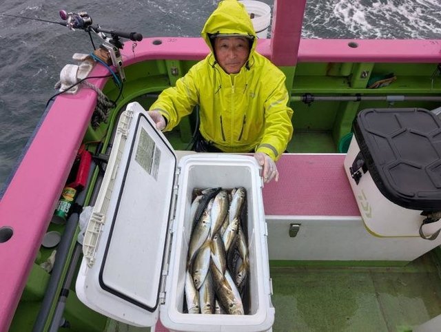 (マアジ)23~40cm 4~18匹 アジ狙いで出船しました。 平均サイズ30cm 外道トロサバ 朝一は雨風で陽気悪く船酔い者続出でしたが後半は凪て来て大丈夫でした、アジは釣れて来ると30cm前後の良いやつですが反応が直ぐ動いてしまい拾い釣りで難しかったでした。 コロナウィルスの為お願いがあります。 乗船日当日の朝必ず体温を計ってから来て下さい。 咳が出てる方、37.5℃以上の方は乗船ご遠慮下さい。 ゴミも感染する可能性がありますので各自お持ち帰り下さい。 朝の受付時、下船時には消毒液を用意してますので使って下さい。 船にもあるので使いたい方はどんどん言って来て下さい。 ご協力よろしくお願いします。 予約状況はHPで確認出来るのでHPで見て下さい。 乗合は2人から出船しますのでお気軽にお問い合わせください。