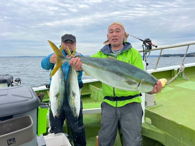 今日は朝からスカッと快晴!天気だけは100点満点。 風は北の微風で気持ち良かったんですが、ウネリがちょっと残っていて、海のコンディションは今ひとつ。 しかも天気予報では「南西風が次第に強まる」との事で、いつ吹き始めるかとみんなでヒヤヒヤ。 が、これがなかなか吹かない。結局、定刻の30分前くらいになってようやくビュッと来ただけで、 「なんだ、もうちょっと頑張れたじゃん!」というオチでした(笑)。 さて、明日3日はというと…その“悪い按配の風”が朝のうち残る予報で、全船休船決定。 でもご安心を。明後日4日は北風に変わる予報ですから、全船元気に出船予定です! アジ五目船、マグロ・カツオ船ともに出ますので、ぜひ遊びに来てください! ?本日のアジ五目船 今日も浅場の根回りから落し込みスタート。 ベイトアジの付きは絶好調で、時折“鈴なり状態”になるほど。 ただし、肝心の本命たちはちょっと気難しい様子…。 「おーい、そろそろ顔出してくれよ~」なんて思っていると、 ようやく竿がググッと曲がり、上がってきたのはイナダ! 続いてまたイナダ、そして青物がポツポツと当たり始め、 2kg弱のカンパチや3kgオーバーのカンパチ、さらにワラサ、アカヤガラも登場。 昨日ほどの爆発力はなかったものの、船中あちこちで笑顔が見られました。 その後、風の予報を気にして少し早めに深場へ移動。 サバがやたら元気で邪魔してくる場面もありましたが、 ラストはデカアジの入れ食いタイム突入! 「これこれ、これを待ってたんだよ!」という声も聞こえるほどで、 皆さんしっかりお土産をゲットしての納竿となりました。 明後日4日からも、朝一は落し込みからのアジ五目リレー船で出船します。 天気も良さそうですし、魚たちもそろそろ秋の本気モード。 ぜひぜひ、竿を片手に遊びにいらしてください!