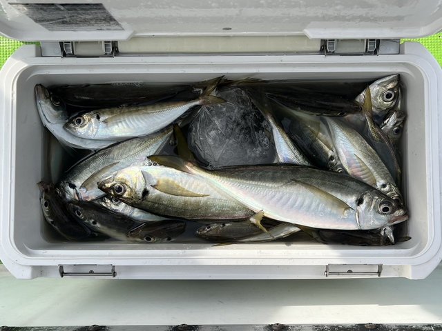 (マアジ)18~35cm 15~70匹 2024年最終日はアジ狙いで出船しました。 平均サイズ25cm 今日も港出て直ぐの所から始めて幅広で黄色いコロコロして美味しそうな走水沖産の小、中アジがポツリポツリ食ってくれてましたが段々と小ぶり目立って来たので場所移動してチョイデカサイズ混じりでポツリポツリ食ってくれて皆さんクーラー一杯お土産確保出来ました。 最終日少し早目に上がらせて貰いました。 差し入れありがとうございます。 コロナウィルスの為お願いがあります。 乗船日当日の朝必ず体温を計ってから来て下さい。 咳が出てる方、37.5℃以上の方は乗船ご遠慮下さい。 ゴミも感染する可能性がありますので各自お持ち帰り下さい。 朝の受付時、下船時には消毒液を用意してますので使って下さい。 船にもあるので使いたい方はどんどん言って来て下さい。 ご協力よろしくお願いします。 予約状況はHPで確認出来るのでHPで見て下さい。 乗合は2人から出船しますのでお気軽にお問い合わせください。